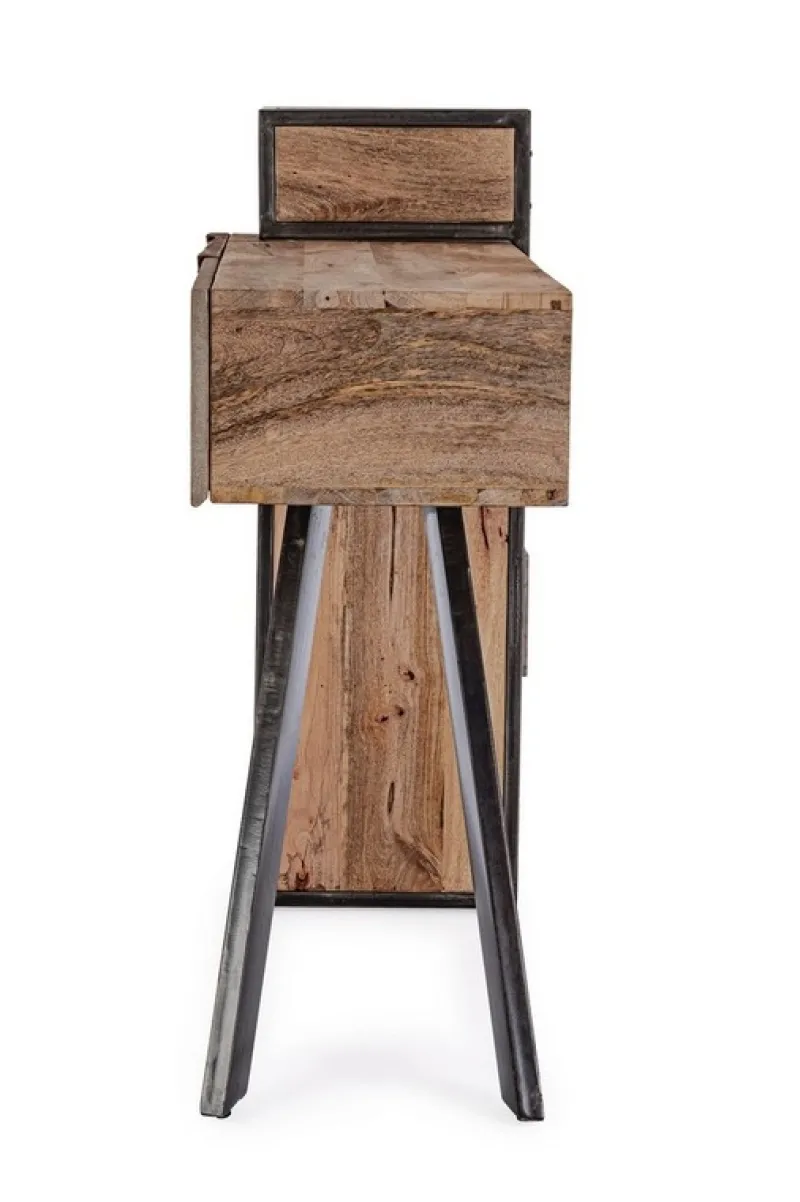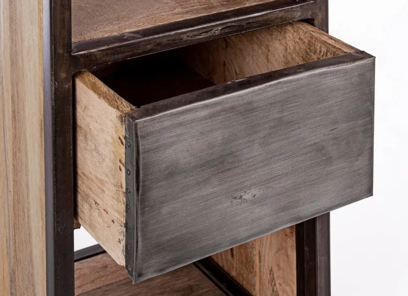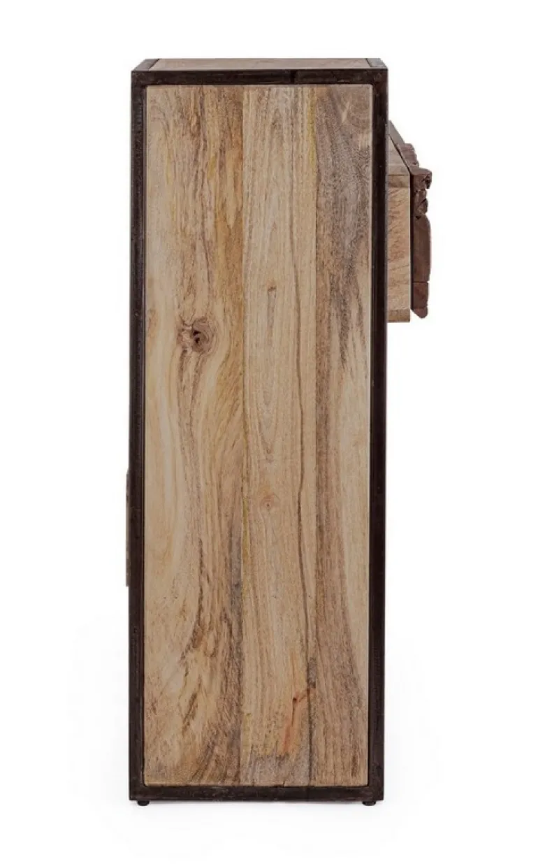 STRUTTURA IN LEGNO MANGO ED ACCIAIO, SCHIENALE IN COMPENSATO. FRONTALE ANTE E CASSETTI IN LEGNO RICICLATO O LAMINA DI ACCIAIO O FINITURA IN FIBRA DI CEMENTO. FINITURA ACRILICA PROTETTIVA. PIEDINI REGOLABILI. IL PRODOTTO IN LEGNO RICICLATO È CARATTERIZZATO DALLA PRESENZA DI TASSELLI IN LEGNO DI DIVERSE SPECIE E COLORE. EVENTUALI FESSURE, CREPE O IMPERFEZIONI, CHE POSSONO