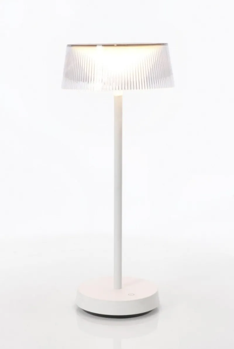 PC, ABS E METALLO, PARALUME IN POLICARBONATO. LAMPADA LED, LUCE DIMMERABILE, RICARICABILE CON CAVO USB 1 MT INCLUSO. TASTO ON/OFF TOUCH. PER USO INTERNO ED ESTERNO, IP44.