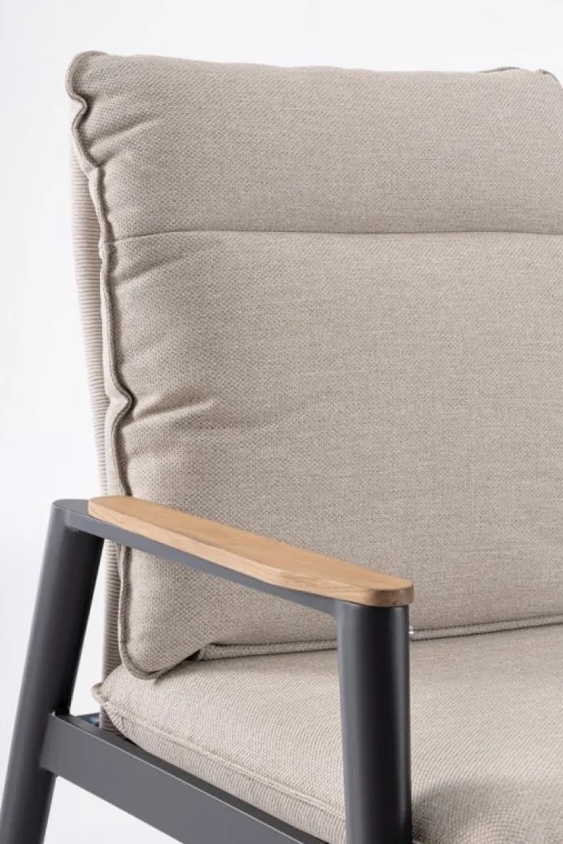 STRUTTURA IN ALLUMINIO VERNICIATA A POLVERE (POLIESTERE). BRACCIOLI CON INSERTI IN TEAK. SCHIENALI (CON INTRECCIO IN CORDA OLEFIN) RECLINABILI IN LIBERA POSIZIONE E SEDUTE IN TEXTILENE 1X1. CUSCINI SFODERABILI CON TESSUTO IDROREPELLENTE OLEFIN (100% POLIPROPILENE). VITERIA IN ACCIAIO INOSSIDABILE. SCHIENALI DA INSERIRE.NON VENDIBILE IN GERMANIA, AUSTRIA, SVIZZERA, PAESI BASSI E LUSSEMBURGO.