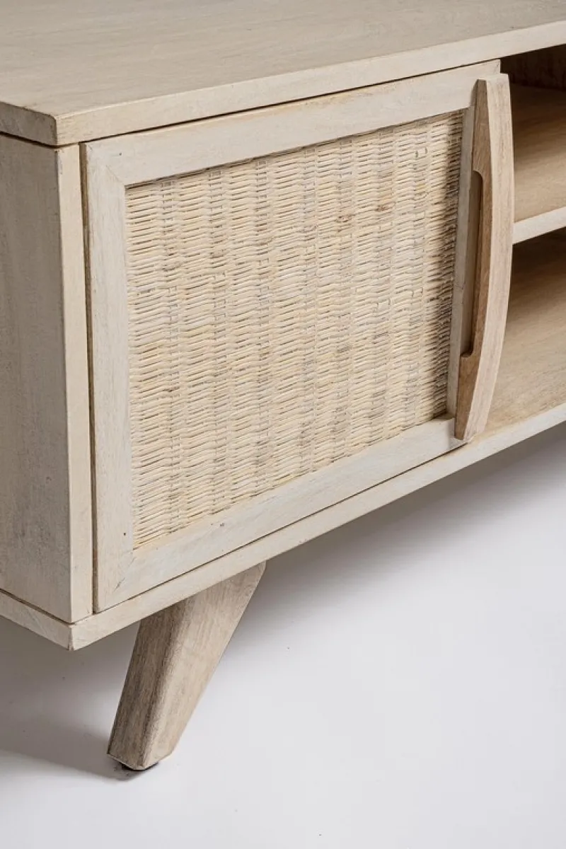 STRUTTURA IN LEGNO DI MANGO, SCHIENALE IN MDF. FRONTALE ANTE IN RATTAN. VERNICIATURA A BASE DI NITROCELLULOSA CON DECAPATURA BIANCA. PIEDINI DA ASSEMBLARE.