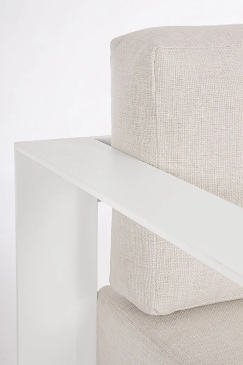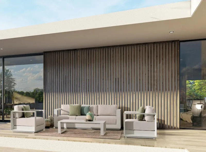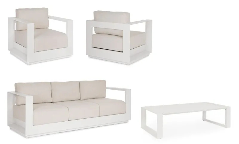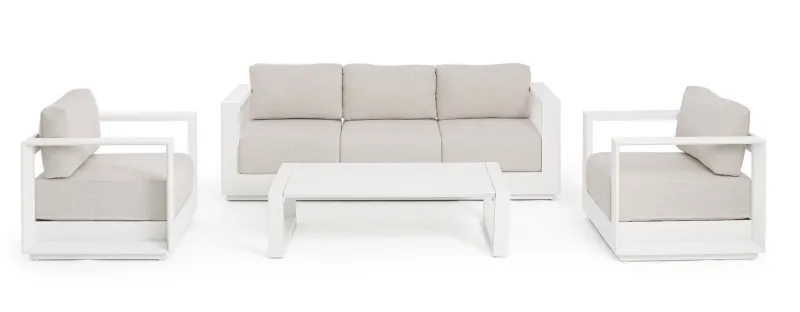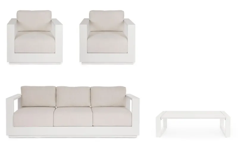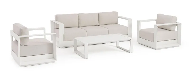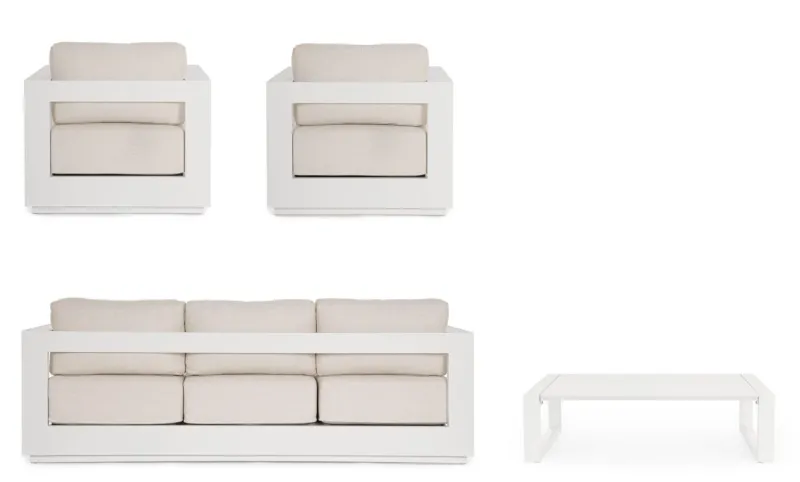 STRUTTURA IN ALLUMINIO VERNICIATO A POLVERE (POLIESTERE). CUSCINI SEDUTA E SCHIENALE SFODERABILI CON TESSUTO IDROREPELLENTE OLEFIN (100% POLIPROPILENE). PIEDINI REGOLABILI. GAMBE TAVOLINO (VITERIA IN ACCIAIO INOSSIDABILE) DA ASSEMBLARE.