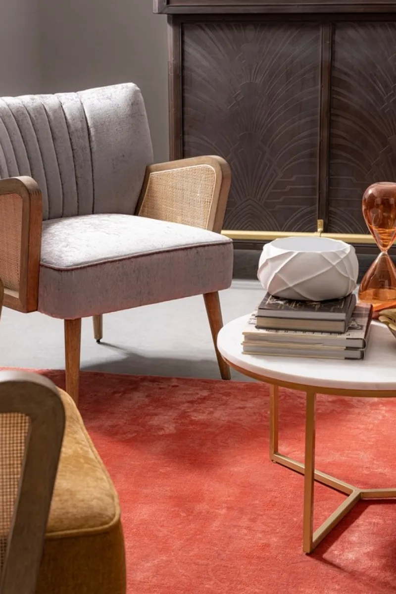 STRUTTURA IN LEGNO DI PINO E COMPENSATO. GAMBE IN RUBBERWOOD. BRACCIOLI CON INSERTI IN RATTAN. RIVESTIMENTO IN POLIESTERE. DENSITA’ IMBOTTITURA IN SCHIUMA POLIURETANICA 24 KG/M3. NON SFODERABILE. GAMBE DA ASSEMBLARE.