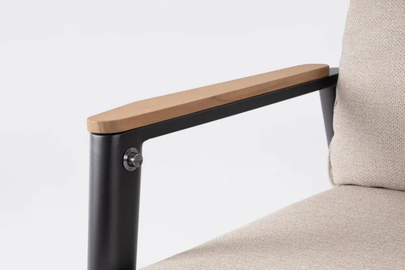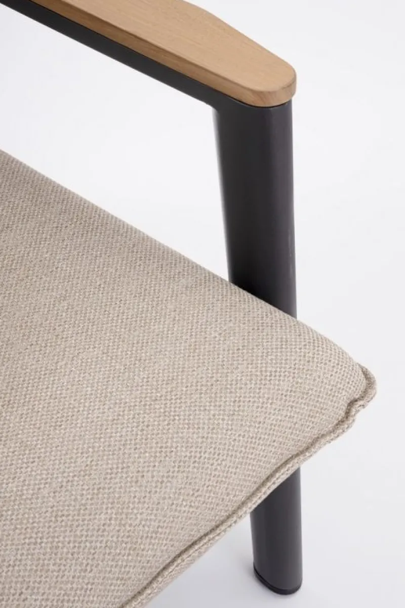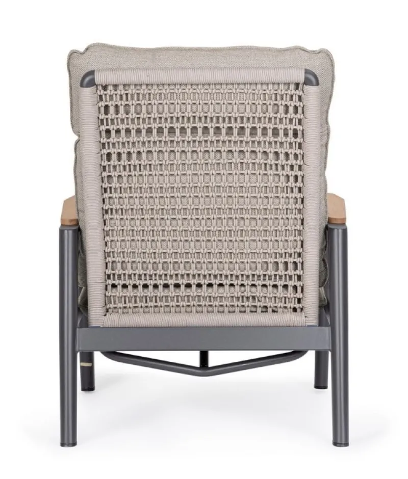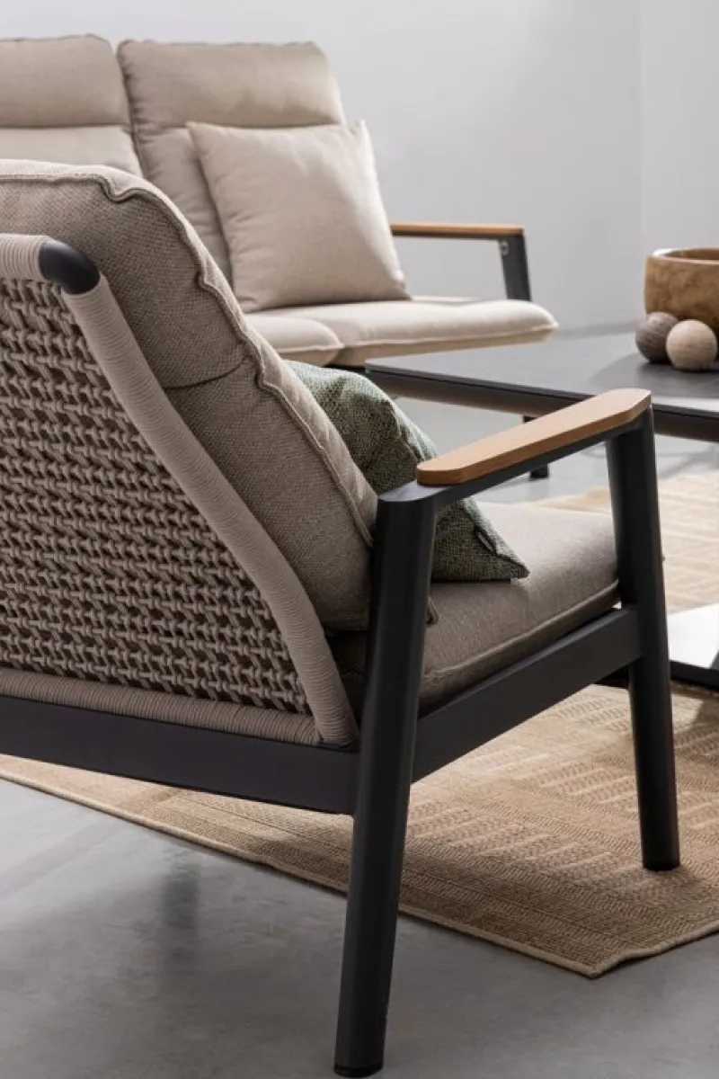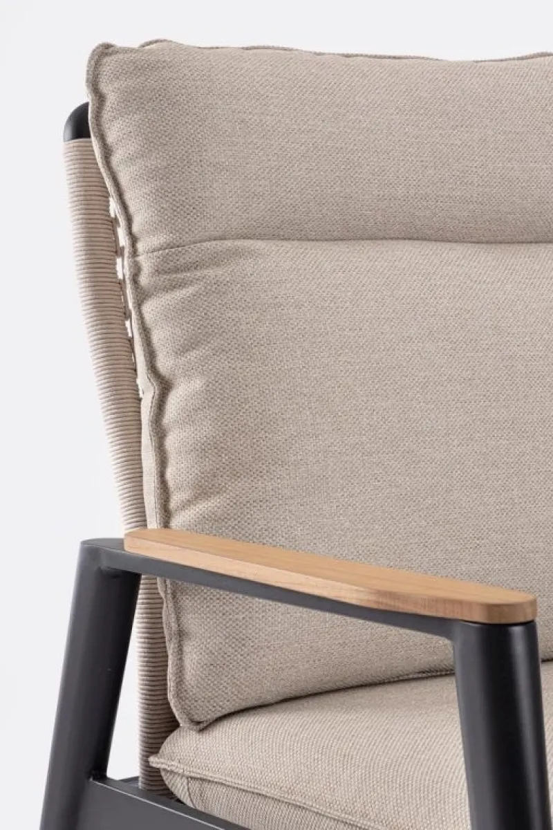 STRUTTURA IN ALLUMINIO VERNICIATA A POLVERE (POLIESTERE). BRACCIOLI CON INSERTI IN TEAK. SCHIENALE (CON INTRECCIO IN CORDA OLEFIN),RECLINABILE IN LIBERA POSIZIONE E SEDUTA IN TEXTILENE 1X1. CUSCINI SFODERABILI CON TESSUTO IDROREPELLENTE OLEFIN (100% POLIPROPILENE). VITERIA IN ACCIAIO INOSSIDABILE. SCHIENALE DA INSERIRE. NON VENDIBILE IN GERMANIA, AUSTRIA, SVIZZERA, PAESI BASSI E LUSSEMBURGO.