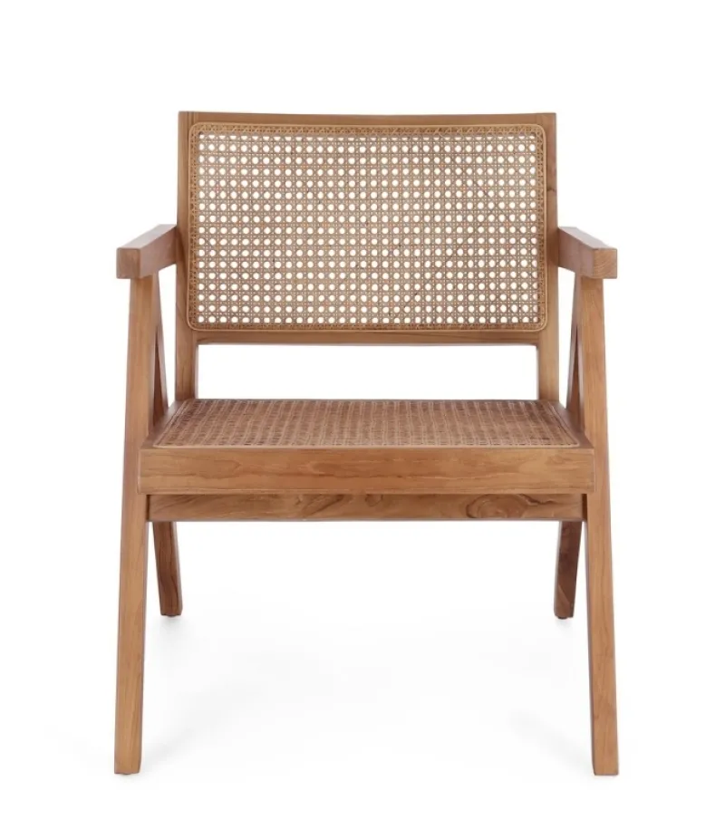 LEGNO TEAK, FINITURA NATURALE CON VERNICE A BASE DI NITROCELLULOSA. SCHIENALE CON INTRECCIO IN RATTAN. SOLO PER USO INTERNO.