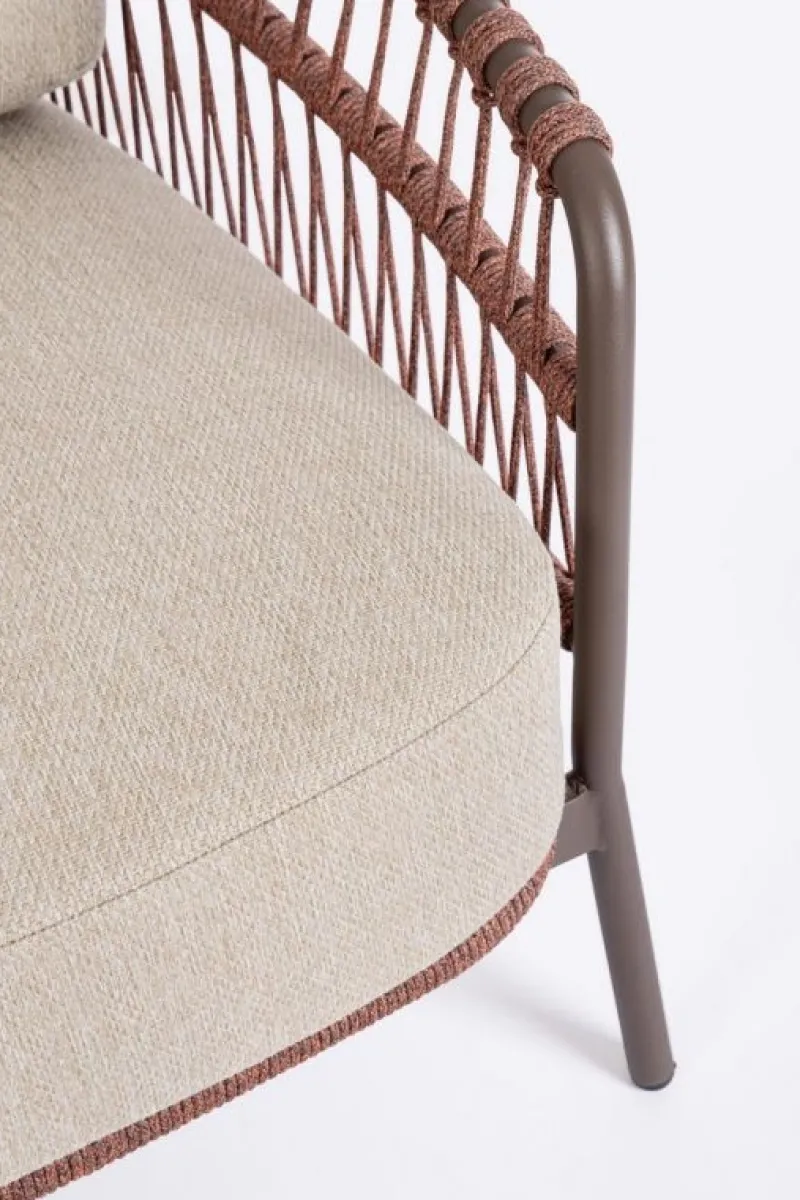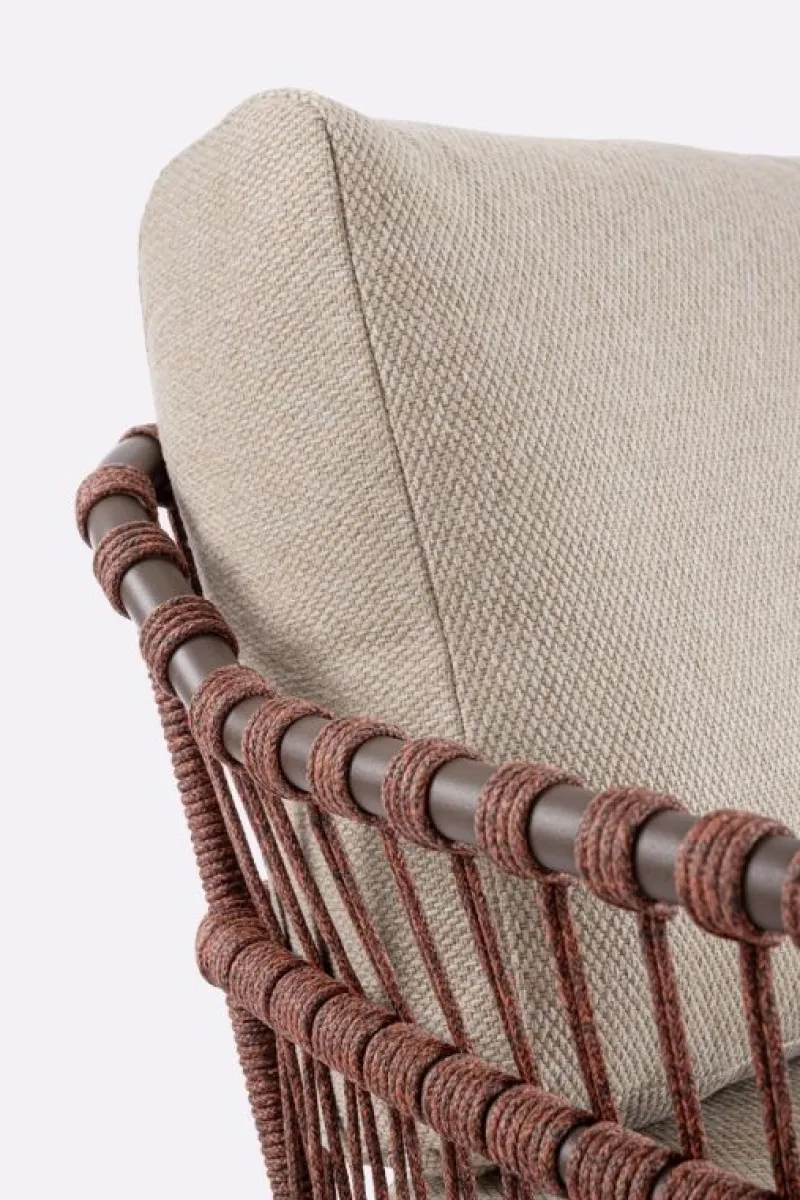 STRUTTURA IN ACCIAIO INOSSIDABILE (201). INTRECCIO PER ESTERNO IN CORDA (POLIPROPILENE). CUSCINI SFODERABILI IN TESSUTO IDROREPELLENTE SUNPROOF OLEFIN (100%POLYPROPYLENE).