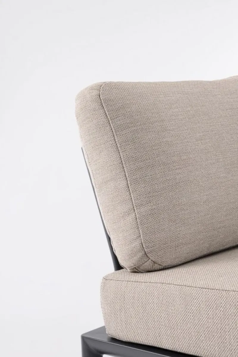 STRUTTURA IN ALLUMINIO VERNICIATA A POLVERE (POLIESTERE). CUSCINI SFODERABILI CON TESSUTO IDROREPELLENTE OLEFIN (100% POLIPROPILENE). SCHIENALI DA INSERIRE.
