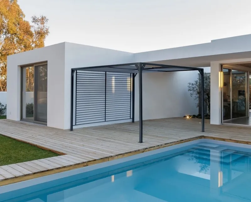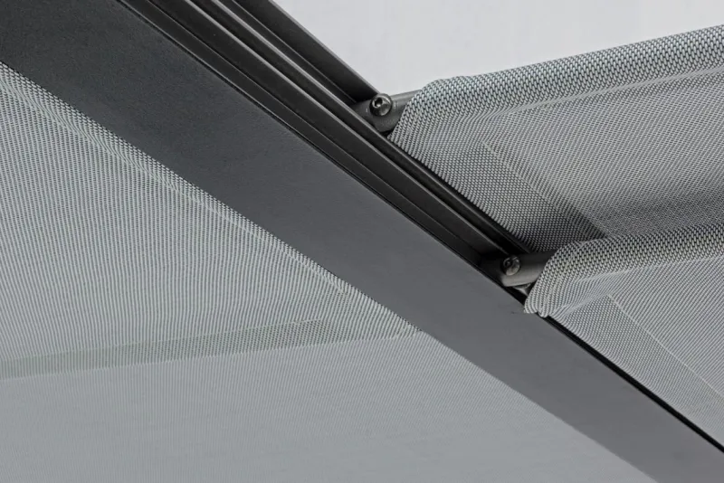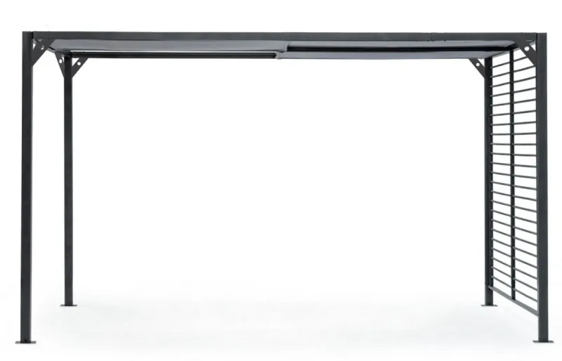 STRUTTURA IN ALLUMINIO VERNICIATO A POLVERE (POLIESTERE). PALI 65X65MM, TETTUCCIO SUPERIORE SCORREVOLE IN TEXTILENE GRIGIO SCURO. DA ASSEMBLARE.