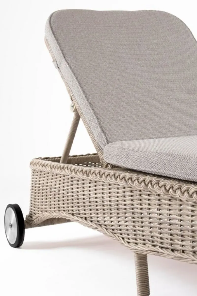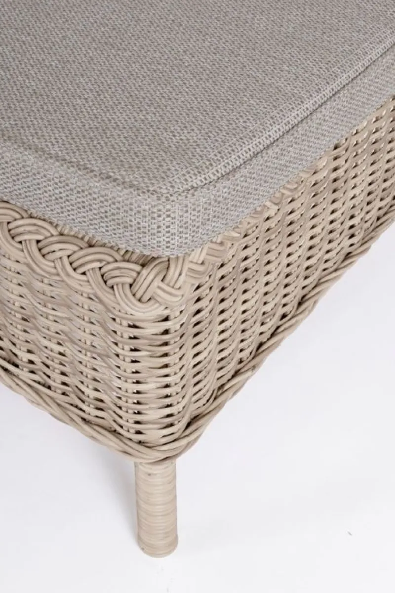 STRUTTURA IN ALLUMINIO VERNICIATO A POLVERE (POLIESTERE), INTRECCIO IN FIBRA SINTETICA (TONDO 5, 3MM).CUSCINI SFODERABILI CON TESSUTO IDROREPELLENTE SUNPROOF OLEFIN (100%POLYPROPYLENE). RUOTE IN ALLUMINIO RIVESTITE DI GOMMA.