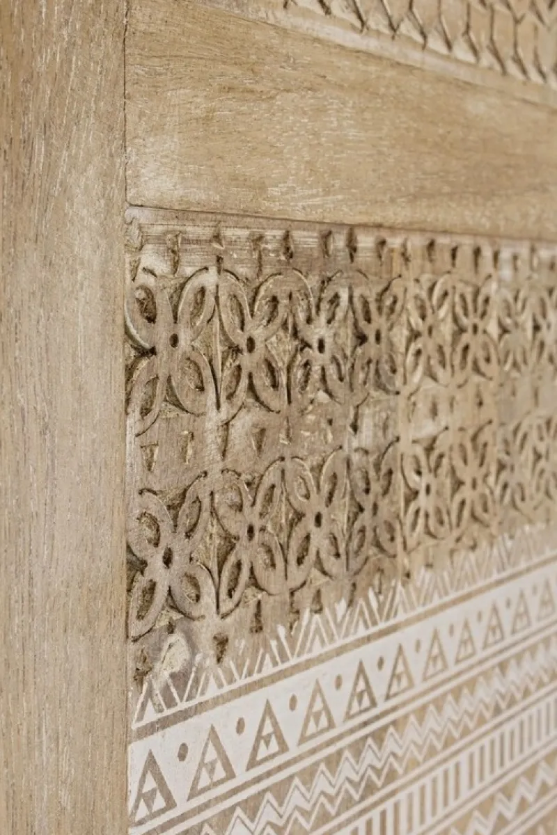 STRUTTURA IN LEGNO DI MANGO CON DECORAZIONI INTARSIATE A MANO, SCHIENALE IN MDF. FINITURA A BASE DI NITROCELLULOSA. VANO PORTA COMPRENSIVO DI MENSOLE. MANIGLIE IN OTTONE.