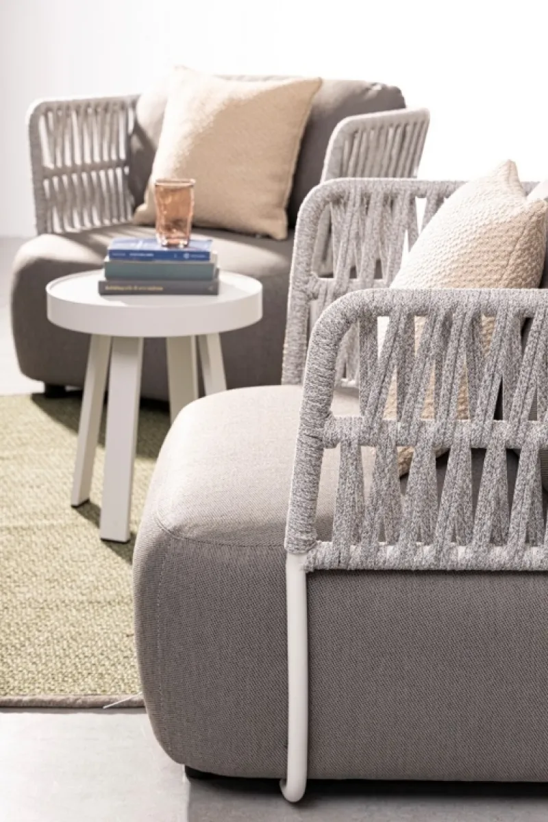 STRUTTURA IN ALLUMINIO VERNICIATO A POLVERE (POLIESTERE). INTRECCIO IN CORDA OLEFIN (100% POLIPROPILENE). SEDUTA CON IMBOTTITURA IMPERMEABILE, RIVESTIMENTO NON SFODERABILE IN TESSUTO PER ESTERNO IN OLEFIN (100% POLIPROPILENE, 285G/M2),IDROREPELLENTE E RESISTENTE AI RAGGI UV (GRADO 7). CUSCINO SCHIENALE SFODERABILE IN TESSUTO OLEFIN.