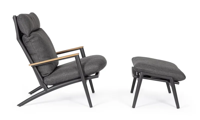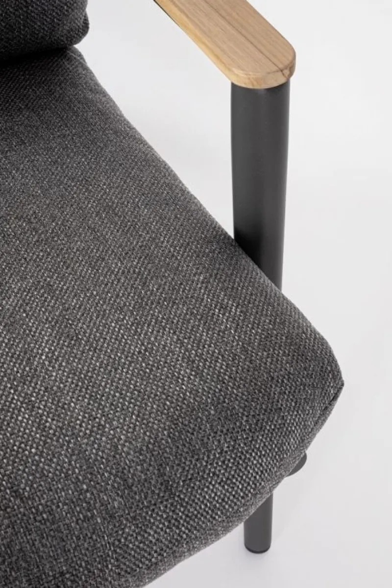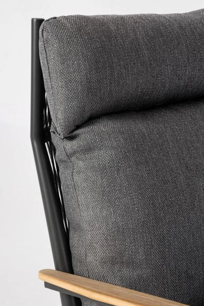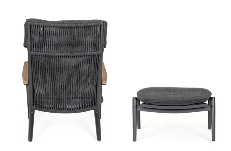 STRUTTURA IN ALLUMINIO VERNICIATO A POLVERE (POLIESTERE). SCHIENALE CON INTRECCIO IN CORDE DI POLIESTERE. BRACCIOLI CON INSERTI IN TEAK. CUSCINI SFODERABILI CON TESSUTO IDROREPELLENTE OLEFIN (100% POLIPROPILENE).