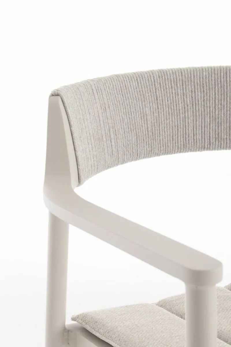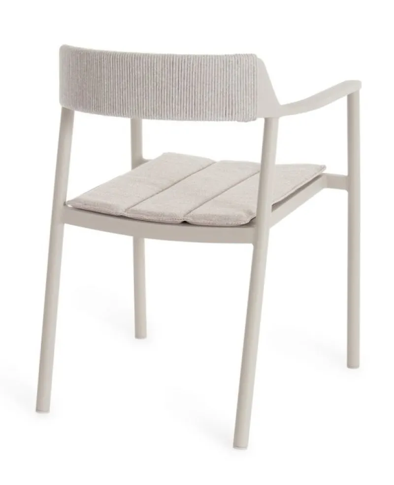 STRUTTURA IN ALLUMINIO VERNICIATO A POLVERE (POLIESTERE). SCHIENALE CON INTRECCIO IN CORDA DI POLIESTERE. CUSCINO SEDUTA SFODERABILE CON TESSUTO IDROREPELLENTE OLEFIN (100% POLIPROPILENE). IMPILABILE.