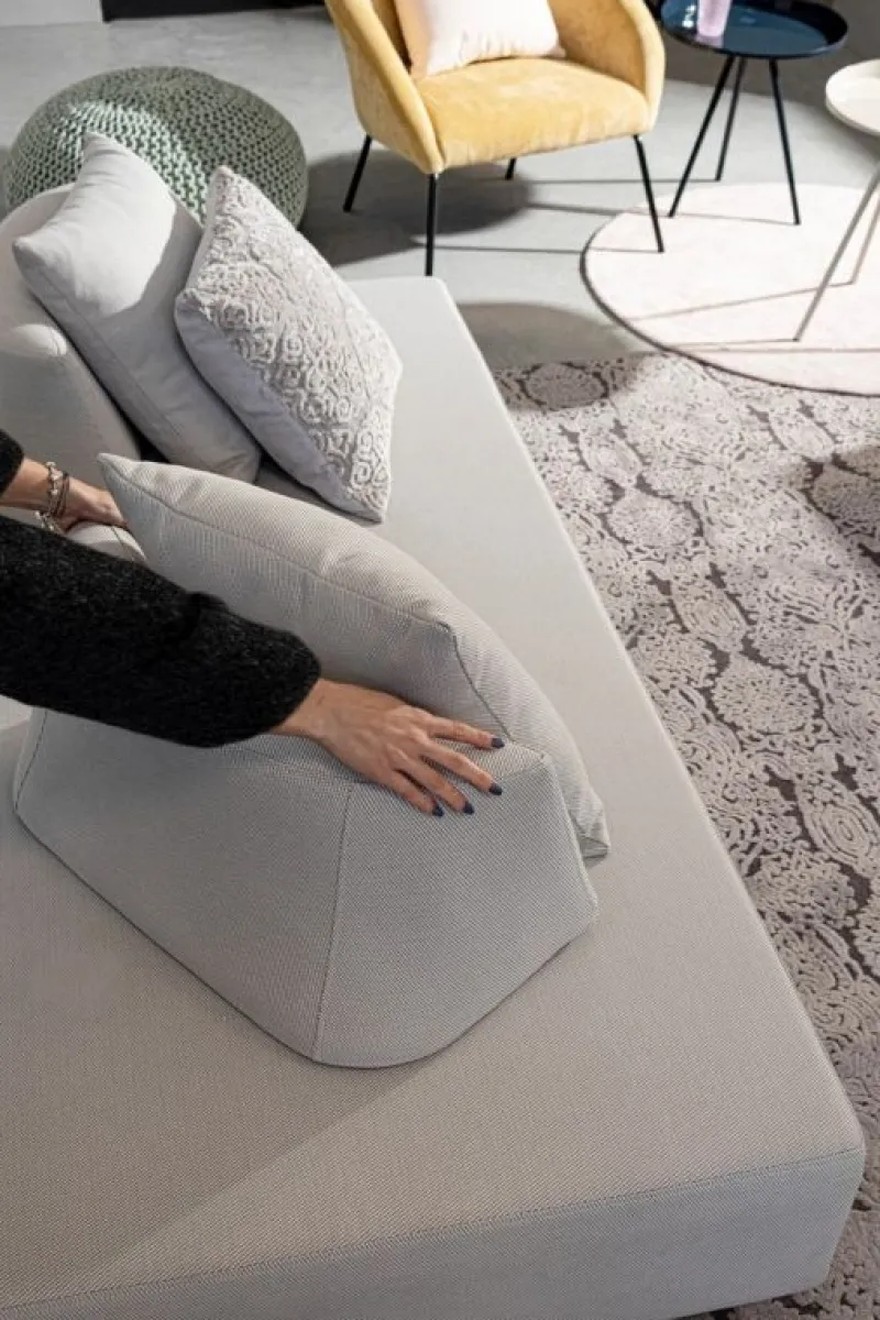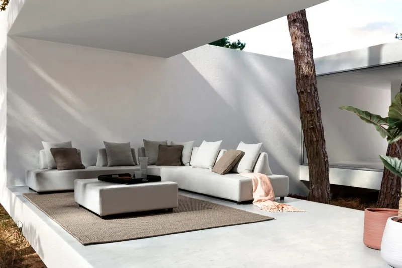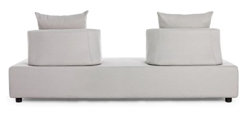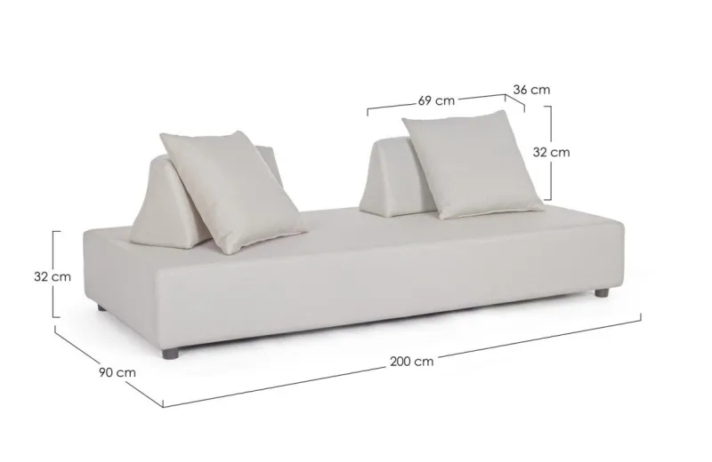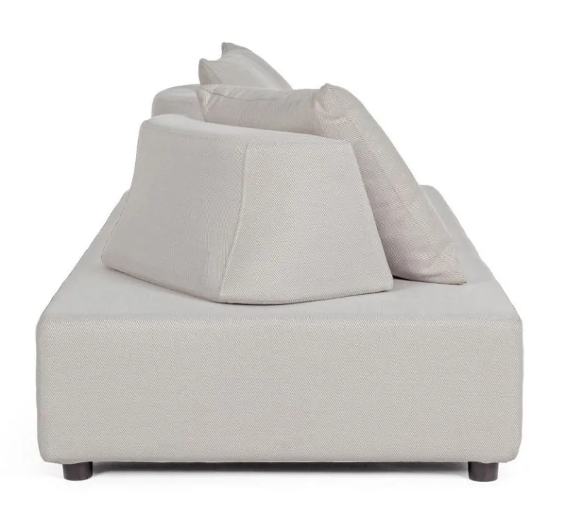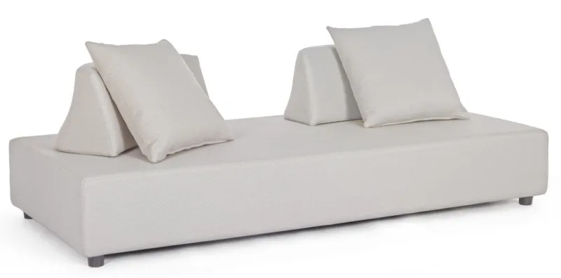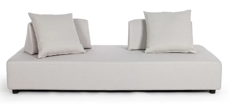 DIVANO CON STRUTTURA IN ALLUMINIO. SCHIENALI REMOVIBILI CON STRUTTURA IN ACCIAIO, GALVANIZZATA A CALDO E VERNICIATA A POLVERE (POLIESTERE). SEDUTA, SCHIENALI E CUSCINI SFODERABILI IN TESSUTO PER ESTERNO OLEFIN (100% POLIPROPILENE, 285GR/M2), IDROREPELLENTE E RESISTENTE AI RAGGI UV (GRADO 7), IMPERMEABILIZZATO INTERNAMENTE CON RIVESTIMENTO IN TESSUTO (POLIURETANO).