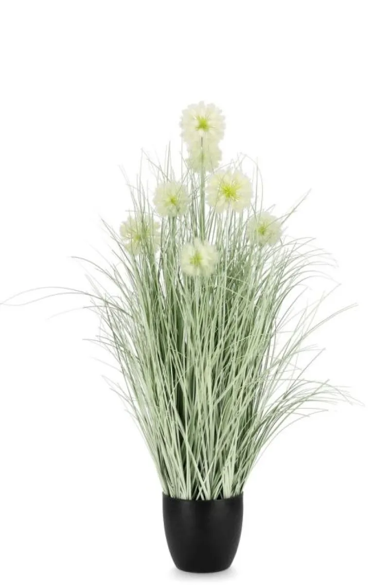 FIORE IN POLIESTERE, STELO IN METALLO E PLASTICA, ERBA IN PVC, VASO IN PLASTICA, CONTENUTO VASO IN CEMENTO PER GARANTIRE STABILITA’