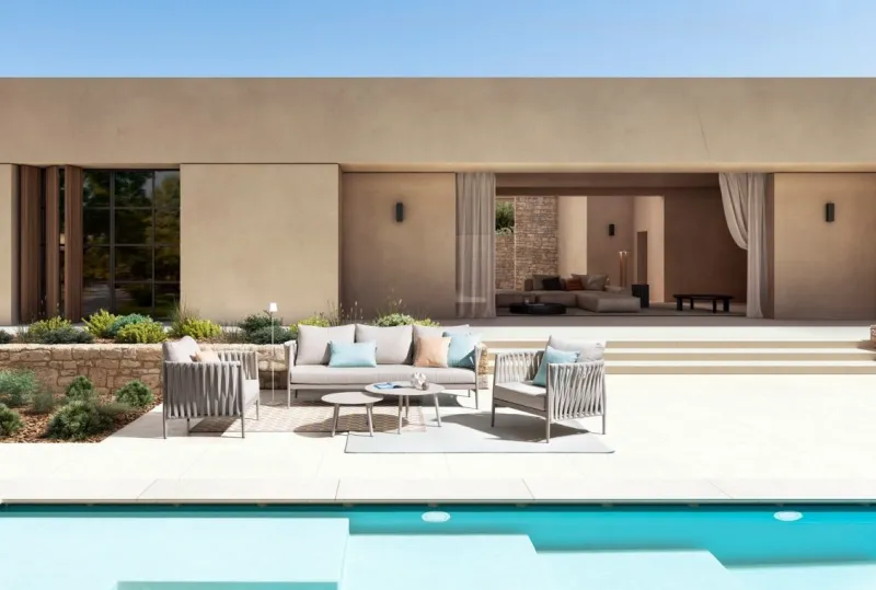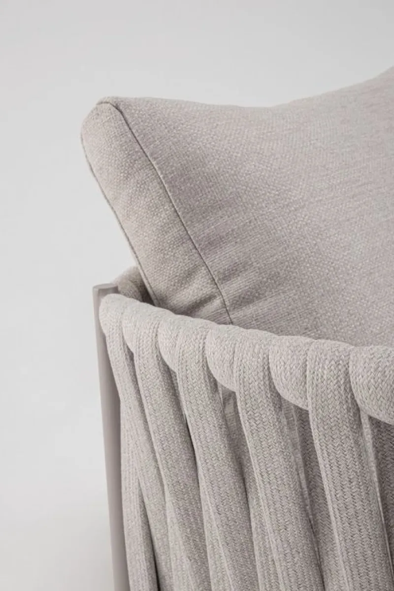 STRUTTURA IN ALLUMINIO VERNICIATO A POLVERE (POLIESTERE). INTRECCIO CON CORDE IN TETORON (100% POLIESTERE) CON IMBOTTITURA IN GOMMA (POLIETILENE). CUSCINO SEDUTA E SCHIENALE SFODERABILE IN TESSUTO IDROREPELLENTE OLEFIN (100% POLIPROPILENE).