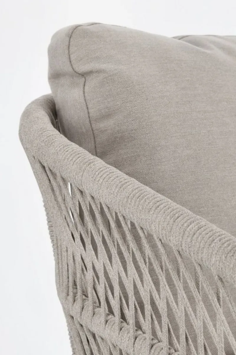 STRUTTURA IN ALLUMINIO VERNICIATA A POLVERE (POLIESTERE). INTRECCIO PER ESTERNO IN CORDA POLIESTERE. CUSCINI SFODERABILI IN TESSUTO IDROREPELLENTE 100% POLIESTERE. IMPILABILE. IMBALLO SENZA CARTONE.