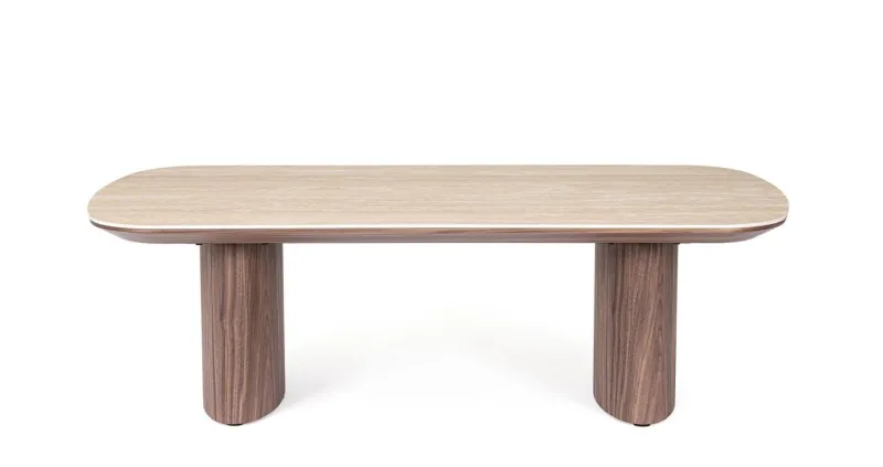 STRUTTURA E GAMBE IN MDF IMPIALLACCIATO LEGNO DI NOCE. FINITURA A BASE DI VERNICE POLIURETANICA. PIANO IN PIETRA SINTERIZZATA (PIETRA NATURALE LAVORATA AD ELEVATE TEMPERATURE) CON EFFETTO TRAVERTINO. GAMBE DA ASSEMBLARE.