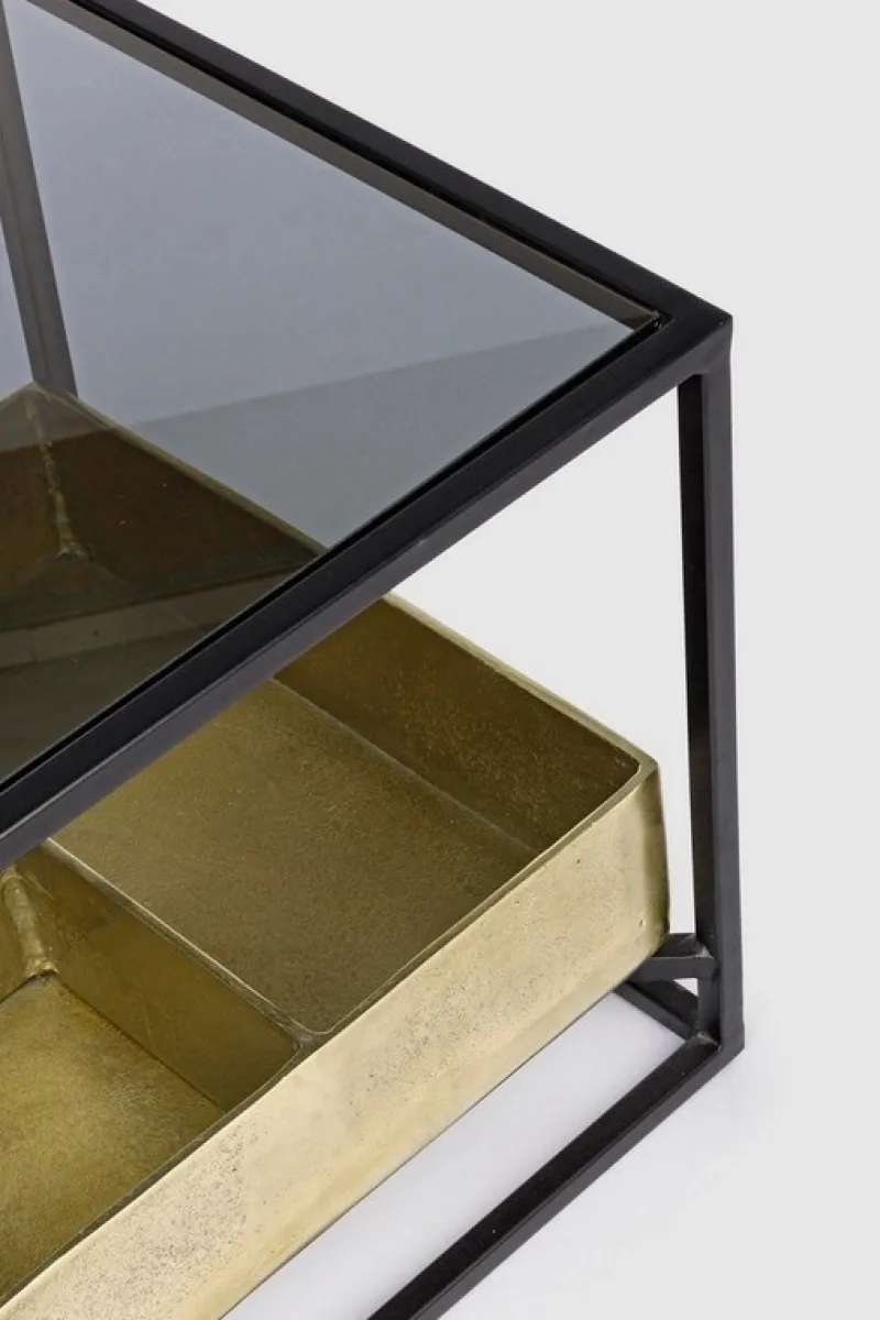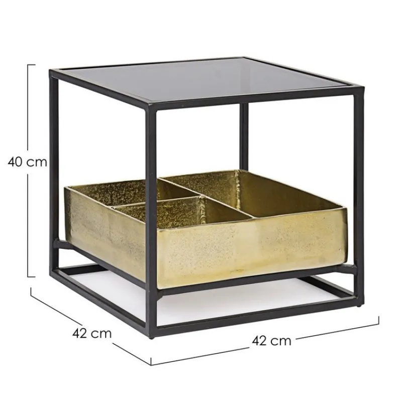 STRUTTURA IN ACCIAIO VERNICIATA A POLVERE EPOSSIDICA. PIANO SUPERIORE IN VETRO TEMPERATO. PIANO INFERIORE CON CONTENITORE IN ALLUMINIO CON FINITURA PLACCATA OTTONE ED ANTICATA.