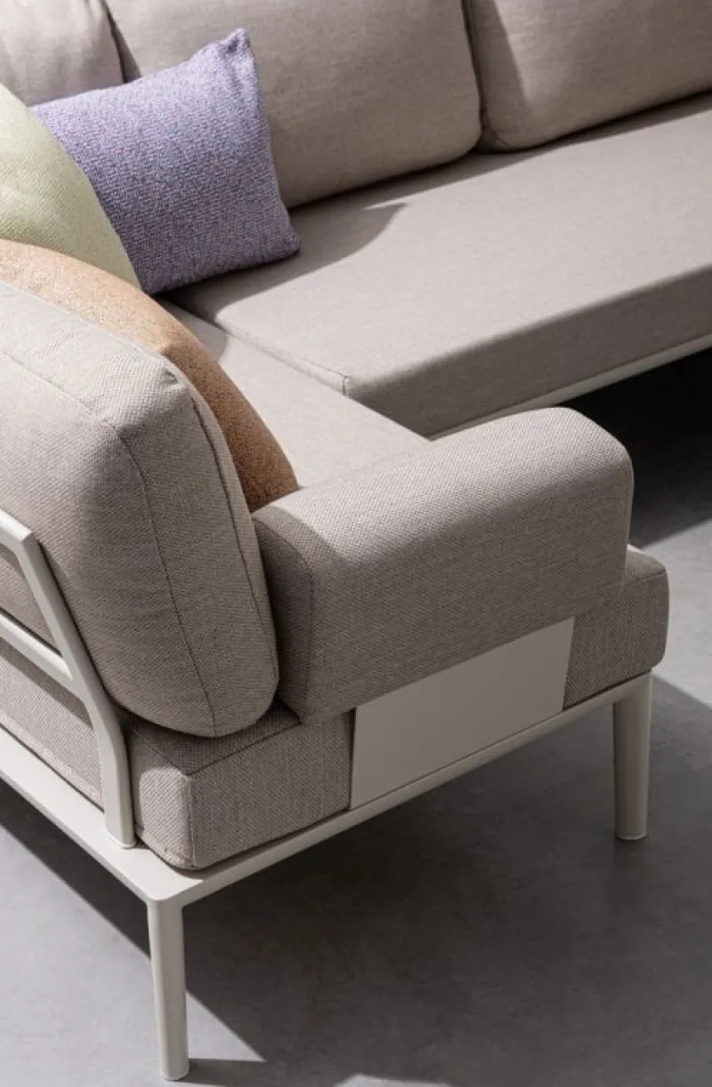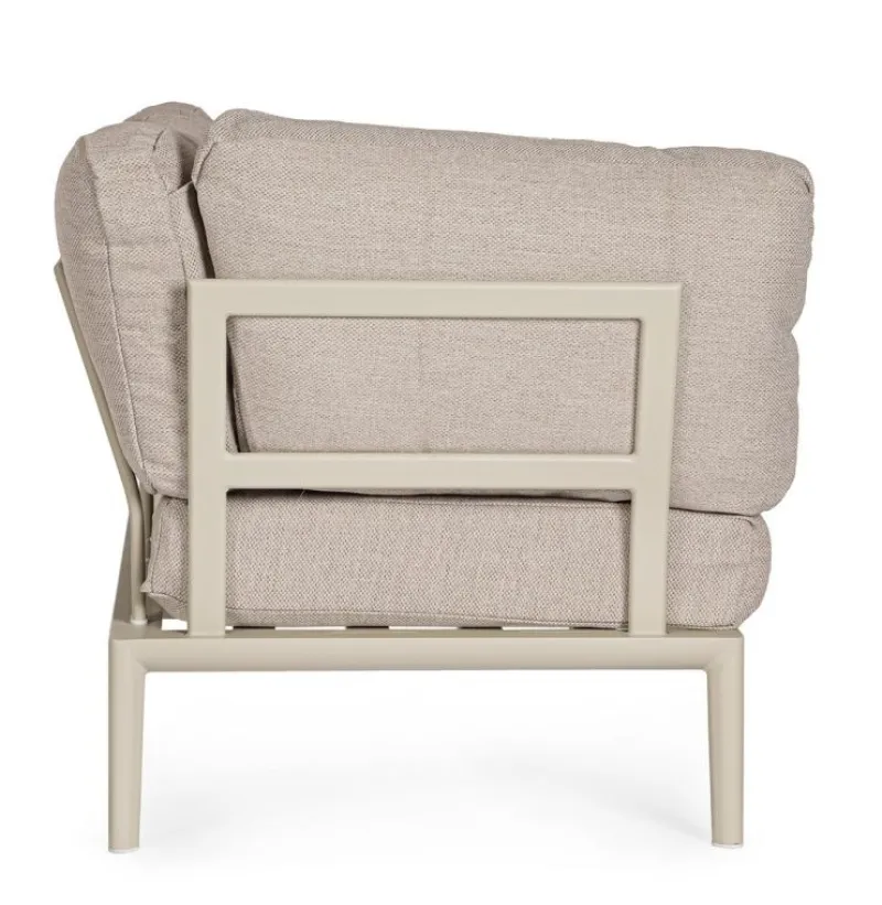 STRUTTURA IN ALLUMINIO VERNICIATA A POLVERE (POLIESTERE). CUSCINI SFODERABILI CON TESSUTO IDROREPELLENTE OLEFIN (100% POLIPROPILENE). SCHIENALI DA INSERIRE.