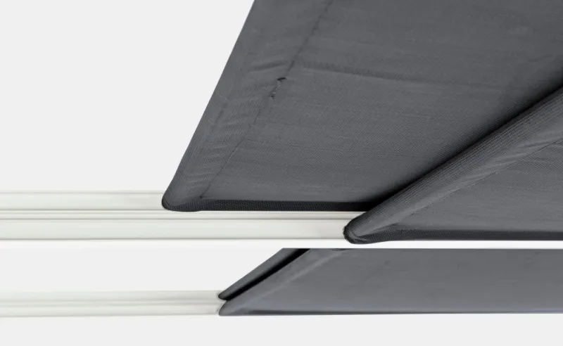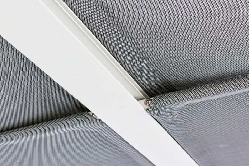 STRUTTURA IN ALLUMINIO VERNICIATO A POLVERE (POLIESTERE). PALI 65X65MM, TETTUCCIO SUPERIORE SCORREVOLE IN TEXTILENE GRIGIO SCURO. DA ASSEMBLARE.