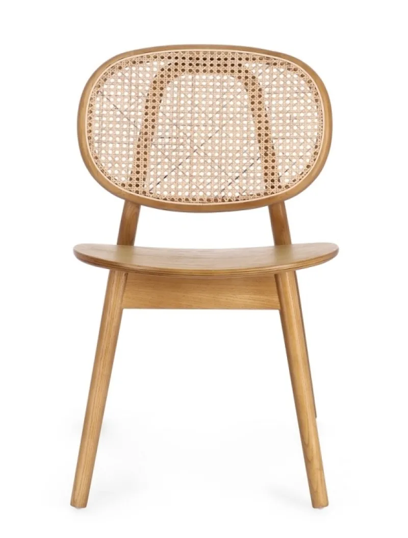 STRUTTURA IN LEGNO DI OLMO, SCHIENALE CON INTRECCIO IN RATTAN, FINITURA POLIURETANICA. IMBALLO SENZA CARTONE.