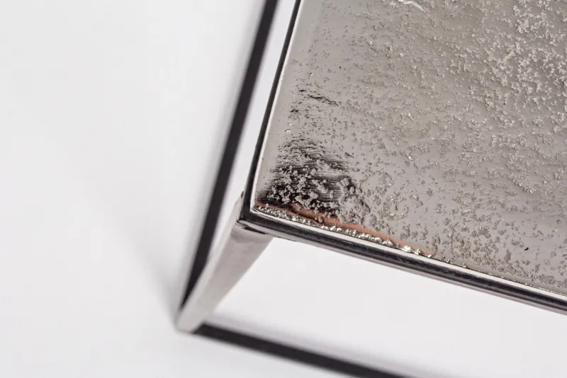 STRUTTURA IN ACCIAIO VERNICIATA A POLVERE EPOSSIDICA. PIANO IN ALLUMINIO CON FINITURA PLACCATA ED ANTICATA.