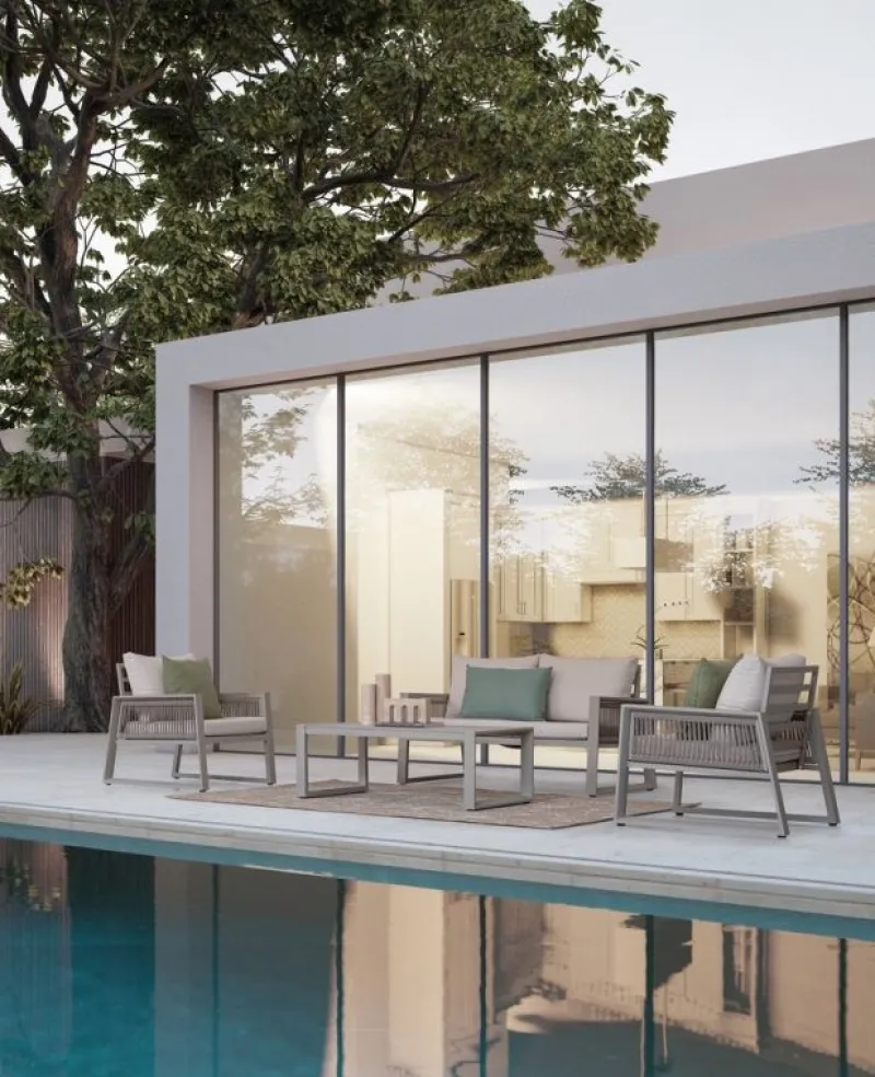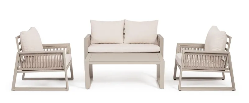 STRUTTURA IN ALLUMINIO, VERNICIATO A POLVERE (POLIESTERE). SEDUTA IN TEXTILENE. INTRECCIO CON CORDE IN TEXTILENE (5MM). CUSCINI SFODERABILI CON TESSUTO IDROREPELLENTE SPUN POLY (POLIESTERE). PIEDINI REGOLABILI. DA ASSEMBLARE.