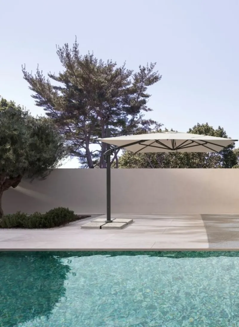 STRUTTURA IN ALLUMINIO VERNICIATA A POLVERE (POLIESTERE). PALO 102×65.5MM. 8 STECCHE 30X18.5MM. TELO COLOR NATURALE IN POLIESTERE 250GR/M2 CON RIVESTIMENTO IN PA (POLIAMMIDE) CON CAMINO ANTIVENTO. BASE A CROCE IN ACCIAIO. PALO GIREVOLE 360° MANUALMENTE. INCLINAZIONE VERTICALE CON IMPUGNATURA A 6 POSIZIONI. DOTATO DI SISTEMA PER INCLINAZIONE OMBRELLO DESTRA-SINISTRA. COMPRENSIVO DI