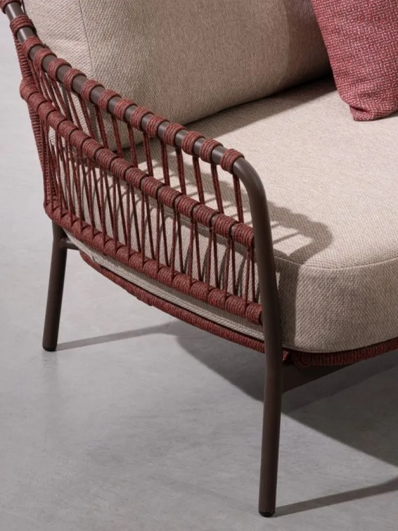 STRUTTURA IN ACCIAIO INOSSIDABILE (201). INTRECCIO PER ESTERNO IN CORDA (POLIPROPILENE). CUSCINI SFODERABILI IN TESSUTO IDROREPELLENTE SUNPROOF OLEFIN (100%POLYPROPYLENE).