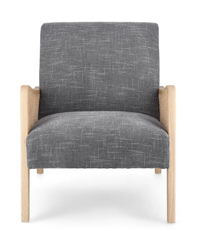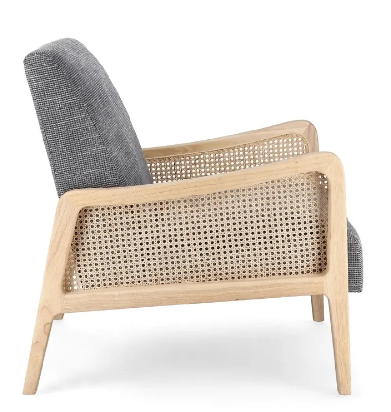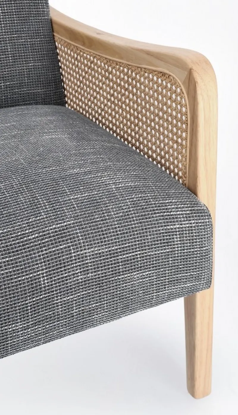 STRUTTURA IN LEGNO DI PINO E COMPENSATO. GAMBE IN RUBBERWOOD. BRACCIOLI CON INSERTI IN RATTAN. RIVESTIMENTO IN POLIESTERE. DENSITA’ IMBOTTITURA IN SCHIUMA POLIURETANICA 24 KG/M3. NON SFODERABILE. GAMBE DA ASSEMBLARE.