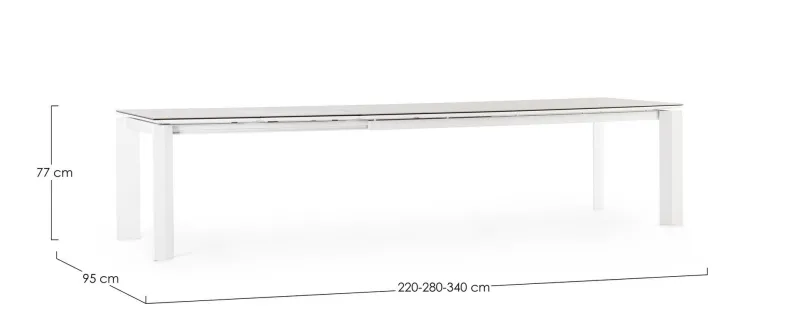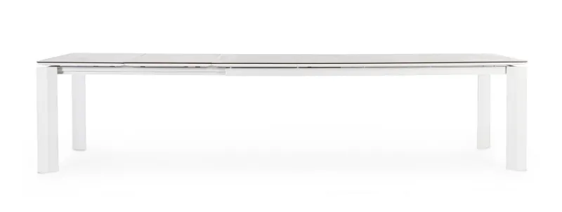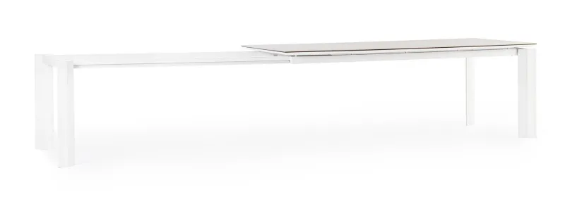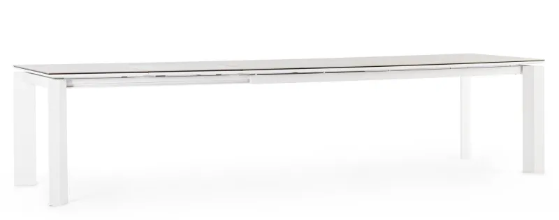 STRUTTURA IN ALLUMINIO VERNICIATO A POLVERE (POLIESTERE). PIANO IN CERAMICA (CON BASE IN VETRO) SPESSORE TOTALE 9MM. ALLUNGABILE CON APERTURA TELESCOPICA. PROLUNGHE ESTERNE CON ALLOGGIO SOTTO IL PIANO. VITERIA IN ACCIAIO INOSSIDABILE. GAMBE DA ASSEMBLARE.