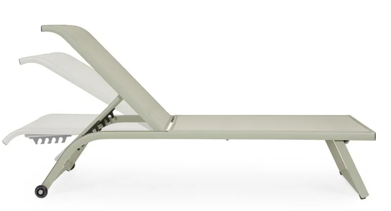 STRUTTURA IN ALLUMINIO, VERNICIATO A POLVERE (POLIESTERE). SEDUTA E SCHIENALE RIVESTITI IN TEXTILENE 2X1 (610G/M2). SCHIENALE RECLINABILE (4 POSIZIONI). VITERIA IN ACCIAIO GALVANIZZATO. RUOTE DA ASSEMBLARE IN PLASTICA (PU).