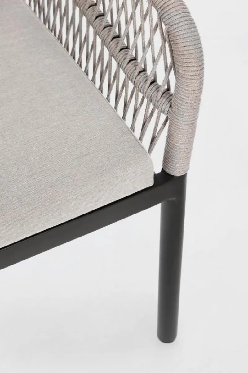 STRUTTURA IN ALLUMINIO VERNICIATA A POLVERE (POLIESTERE). INTRECCIO PER ESTERNO IN CORDA POLIESTERE. CUSCINI SFODERABILI IN TESSUTO IDROREPELLENTE 100% POLIESTERE. IMPILABILE. IMBALLO SENZA CARTONE.