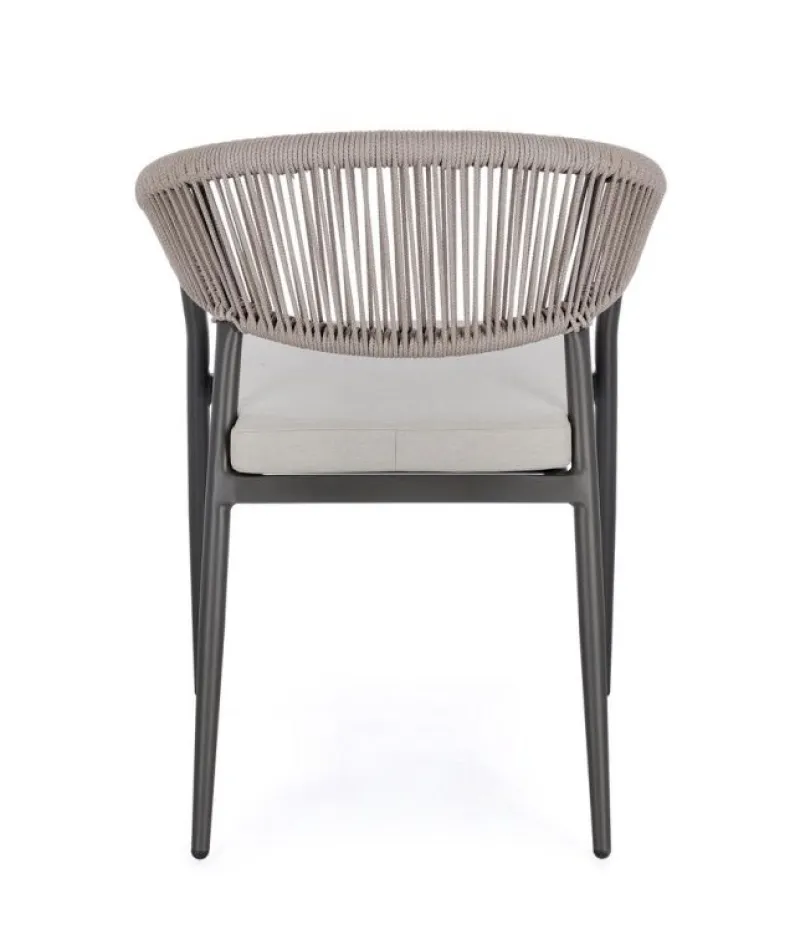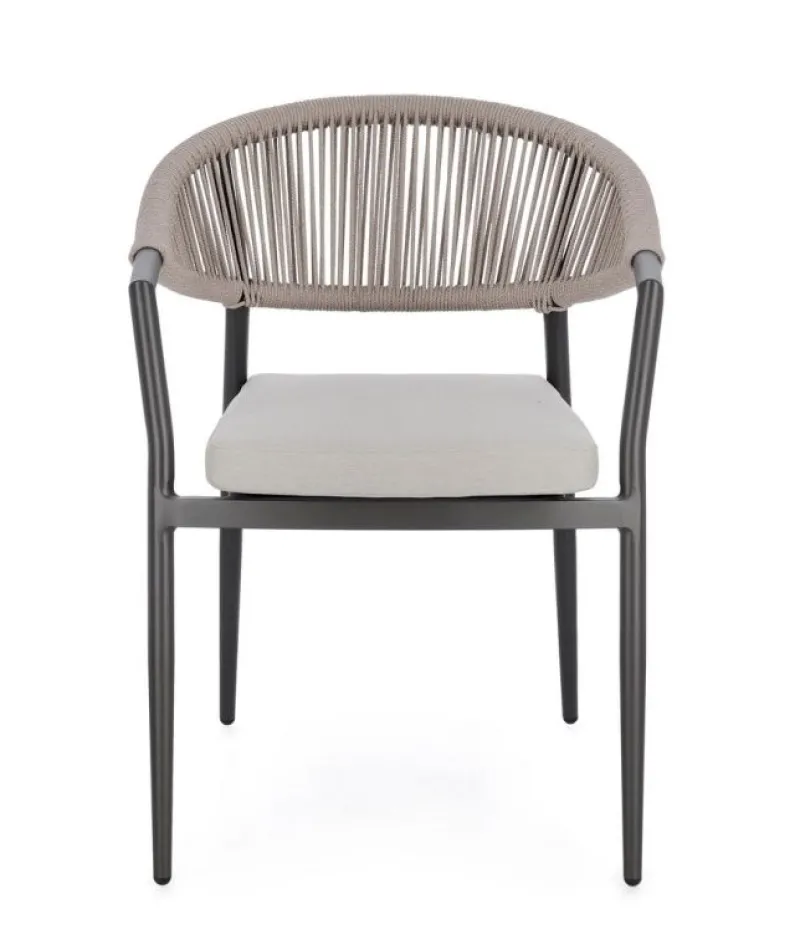 STRUTTURA IN ALLUMINIO VERNICIATA A POLVERE (POLIESTERE). INTRECCIO PER ESTERNO IN CORDA POLIESTERE. CUSCINI SFODERABILI IN TESSUTO IDROREPELLENTE 100% POLIESTERE. IMPILABILE.