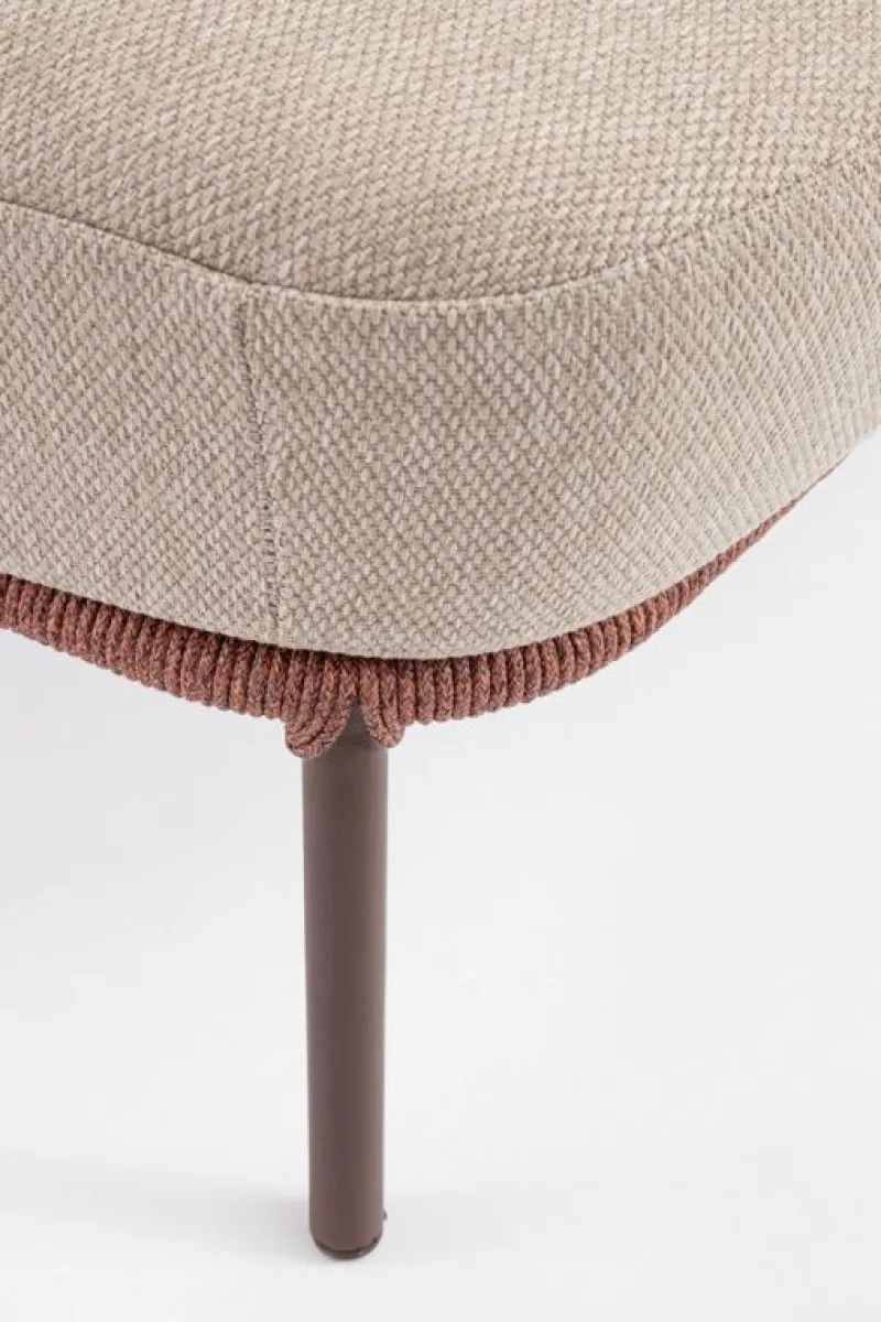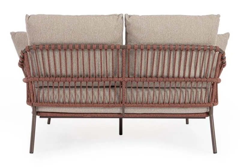 STRUTTURA IN ACCIAIO INOSSIDABILE (201). INTRECCIO PER ESTERNO IN CORDA (POLIPROPILENE). CUSCINI SFODERABILI IN TESSUTO IDROREPELLENTE SUNPROOF OLEFIN (100%POLYPROPYLENE).