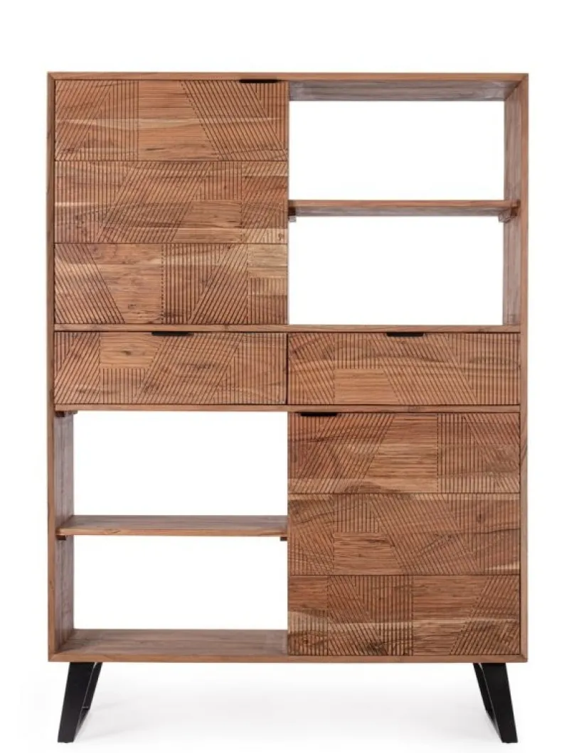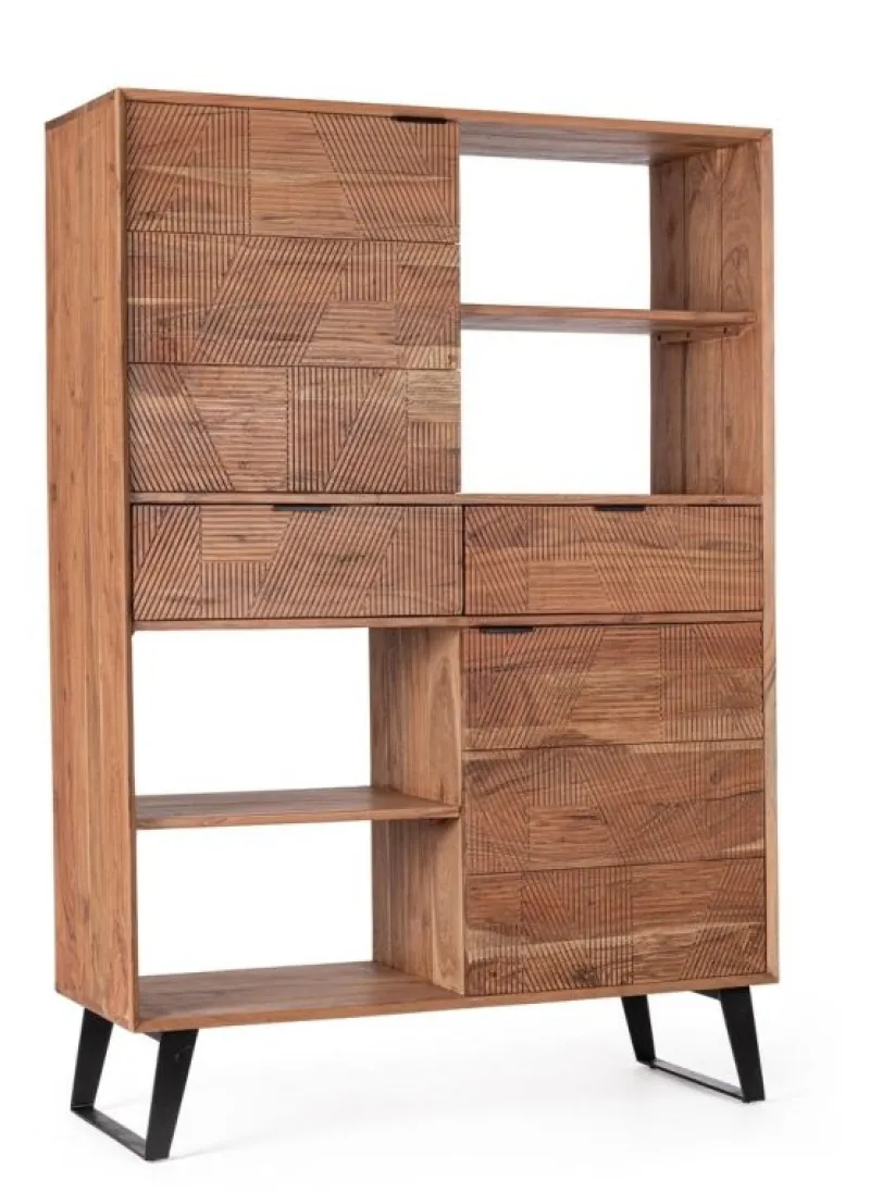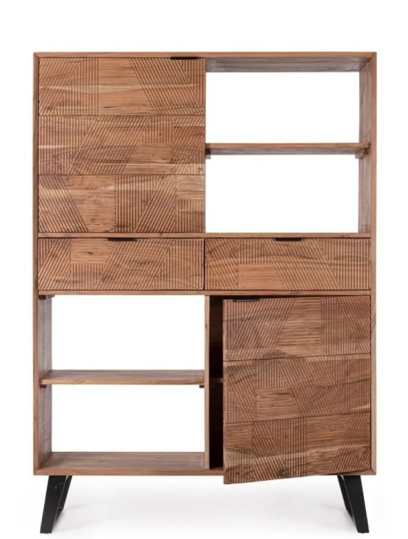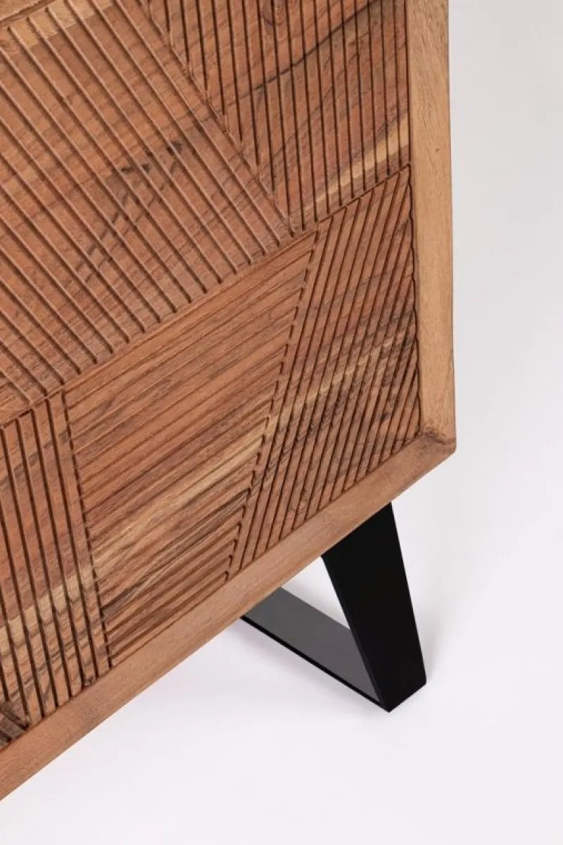 STRUTTURA IN LEGNO DI ACACIA, SCHIENALI E FONDO CASSETTI IN COMPENSATO. FRONTALI ANTE E CASSETTI INTARSIATI E LAVORATI A MANO. FINITURA ACRILICA PROTETTIVA. MANIGLIE E GAMBE IN ACCIAIO. GAMBE DA ASSEMBLARE.