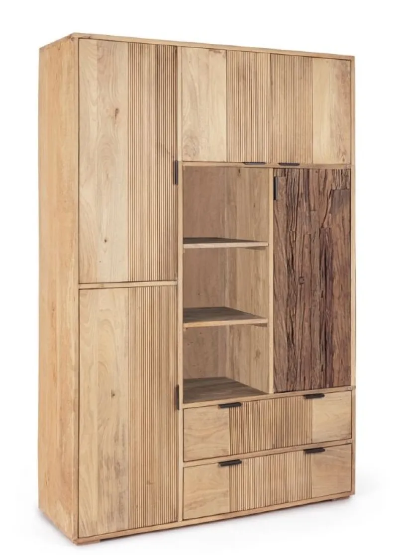 STRUTTURA IN LEGNO MANGO, SCHIENALE IN COMPENSATO. FRONTALE ANTE IN LEGNO DI MANGO O RICICLATO. FINITURA ACRILICA PROTETTIVA. VANO PORTA COMPRENSIVO DI MENSOLA. MANIGLIE IN METALLO. IL PRODOTTO IN LEGNO RICICLATO È CARATTERIZZATO DALLA PRESENZA DI TASSELLI IN LEGNO DI DIVERSE SPECIE E COLORE. EVENTUALI FESSURE, CREPE O IMPERFEZIONI, CHE POSSONO GENERARSI ANCHE NEL CORSO DEL TEMPO, SONO CARATTERISTICHE DI QUESTO MATERIALE E RENDONO OGNI PEZZO UNICO E ORIGINALE.