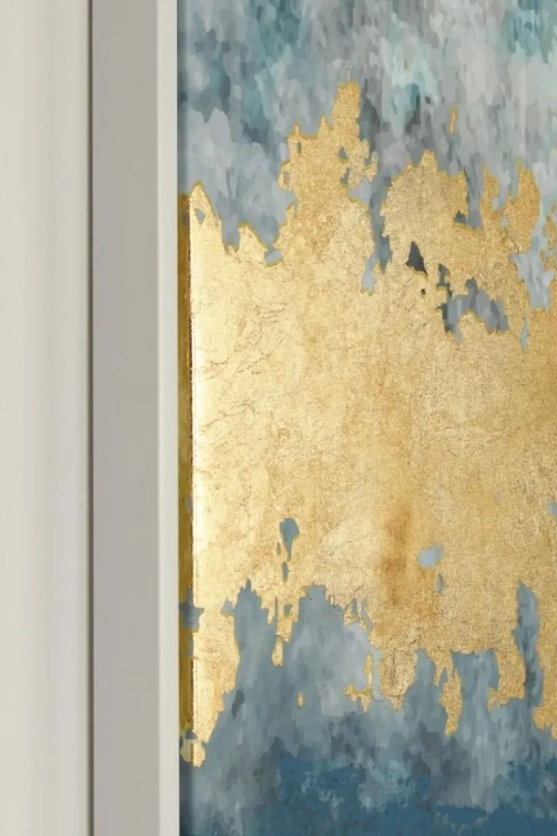 STAMPA SU TELA DIPINTA A MANO CON APPLICAZIONI FOGLI DORATI. CORNICE IN MDF.