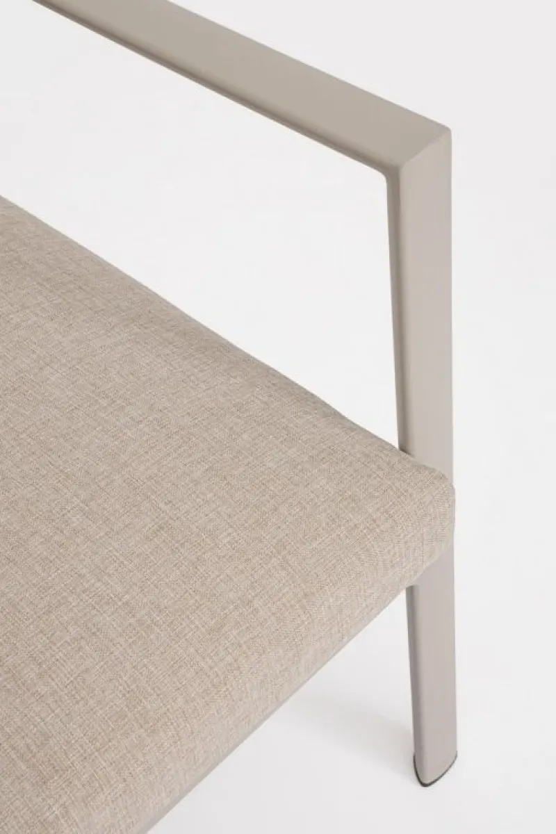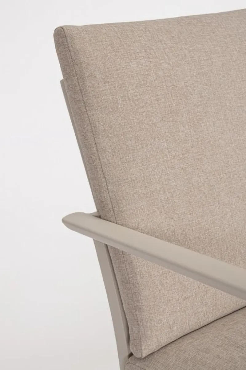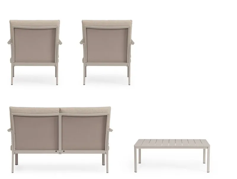 STRUTTURA IN ALLUMINIO, VERNICIATO A POLVERE (POLIESTERE). SEDUTA E SCHIENALE IN TEXTILENE 1X1. CUSCINI SFODERABILI CON TESSUTO IDROREPELLENTE OLEFIN (100% POLIPROPILENE). VITERIA IN ACCIAIO INOSSIDABILE. SCHIENALI E GAMBE TAVOLINO DA ASSEMBLARE.