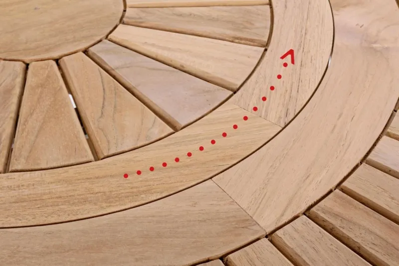 LEGNO TEAK (CLASSE A) – SVLK (LEGNO CERTIFICATO PROVENIENTE DA FORESTE SOSTENIBILI). PIANO CENTRALE GIREVOLE. VITERIA IN ACCIAIO INOSSIDABILE. GAMBE DA ASSEMBLARE.