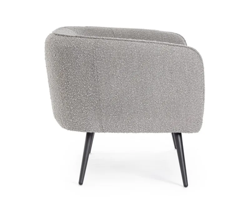 STRUTTURA IN LEGNO COMPENSATO, GAMBE IN ACCIAIO VERNICIATO A POLVERE EPOSSIDICA. RIVESTIMENTO IN POLIESTERE EFFETTO BOUCLE’. DENSITA’ IMBOTTITURA SEDUTA 28KG/M3 SCHIENALE 20KG/M3. NON SFODERABILE. GAMBE DA ASSEMBLARE.