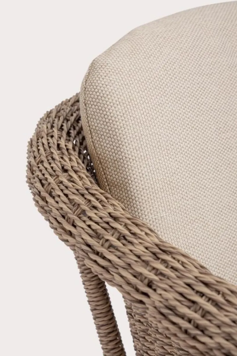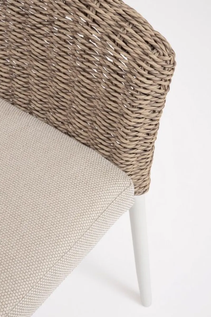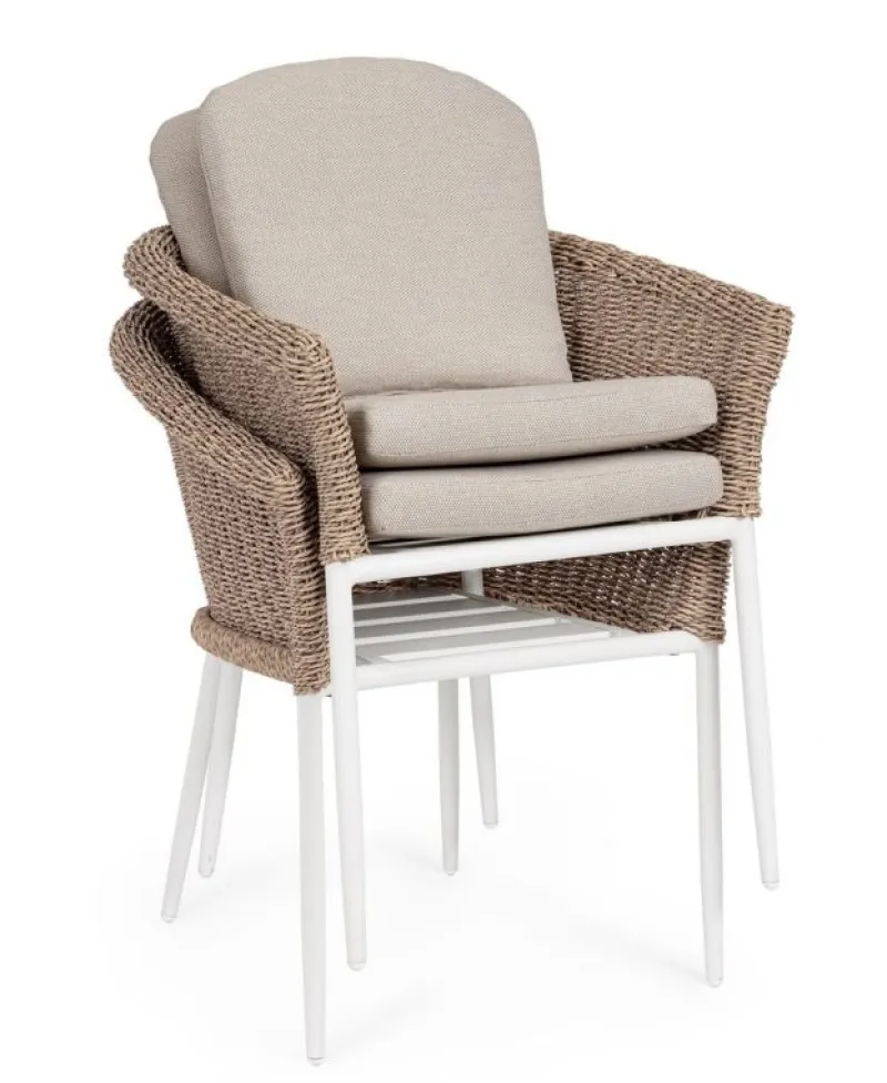 STRUTTURA E GAMBE IN ALLUMINIO VERNICIATE A POLVERE (POLIESTERE). SEDUTA RIVESTITA IN FIBRA SINTETICA (TONDA 3.5MM). CUSCINI SEDUTA E SCHIENALE SFODERABILI CON TESSUTO IDROREPELLENTE OLEFIN (100% POLIPROPILENE). IMPILABILE.