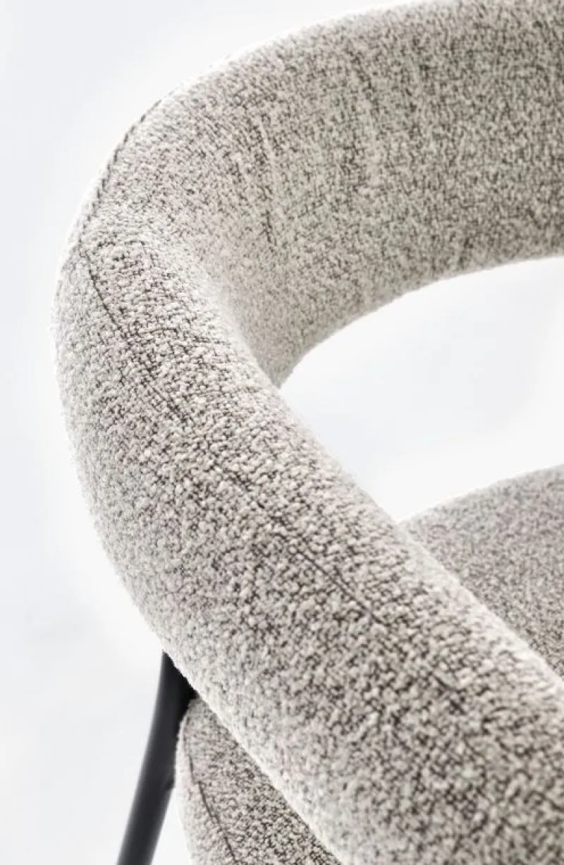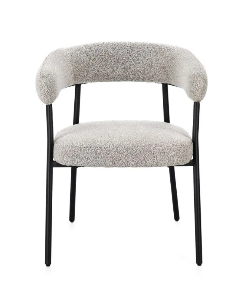 STRUTTURA IN COMPENSATO. GAMBE IN ACCIAIO VERNICIATO A POLVERE. IMBOTTITURA IN SCHIUMA POLIURETANICA DENSITA’ 22 KG/M3. RIVESTIMENTO IN POLIESTERE EFFETTO BOUCLE’ . DA ASSEMBLARE.