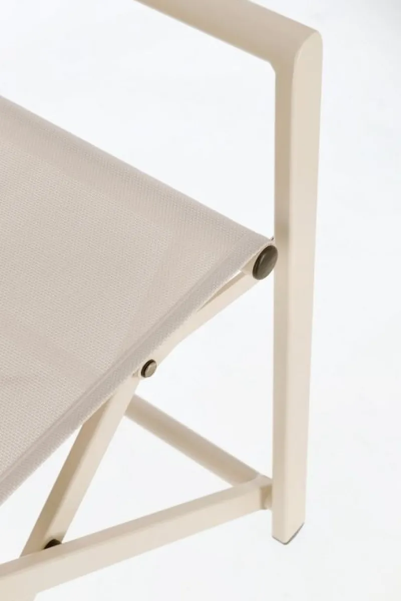 STRUTTURA IN ALLUMINIO, VERNICIATO A POLVERE (POLIESTERE). SEDUTA E SCHIENALE IN TEXTILENE 2X1 (610G/M2), CON CUCITURE TERMOSALDATE. FERRAMENTA IN ACCIAIO GALVANIZZATO. PIEGHEVOLE.