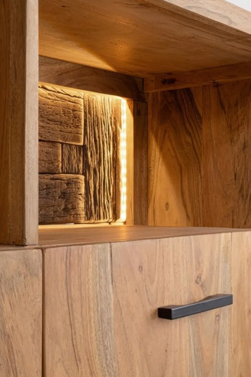 STRUTTURA IN LEGNO DI ACACIA, SCHIENALI IN COMPENSATO, INTERNO A VISTA IN LEGNO RICICLATO. FINITURA ACRILICA PROTETTIVA. ANTE CON CERNIERA CHIUSURA AMMORTIZZATA. MANIGLIE E GAMBE IN ACCIAIO. VANO PORTA COMPRENSIVO DI MENSOLA. GAMBE DA ASSEMBLARE.