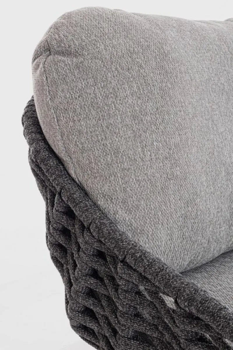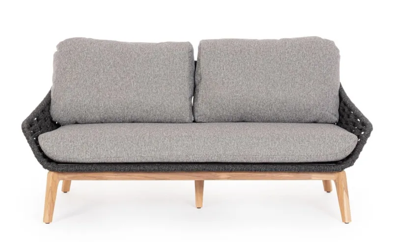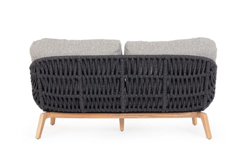 STRUTTURA IN ALLUMINIO VERNICIATA A POLVERE (POLIESTERE). GAMBE IN TEAK – SVLK (LEGNO CERTIFICATO PROVENIENTE DA FORESTE SOSTENIBILI). INTRECCIO PER ESTERNO IN CORDA (POLIPROPILENE). CUSCINI SFODERABILI IN TESSUTO IDROREPELLENTE SUNPROOF OLEFIN (100%POLYPROPYLENE). VITERIA IN ACCIAIO INOSSIDABILE. GAMBE DA ASSEMBLARE.