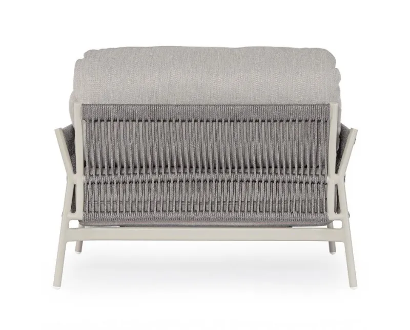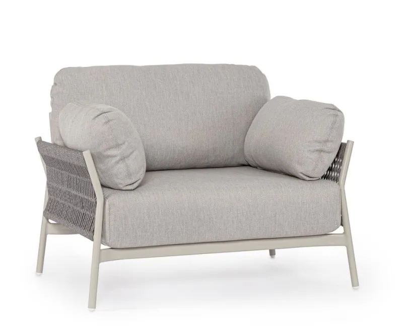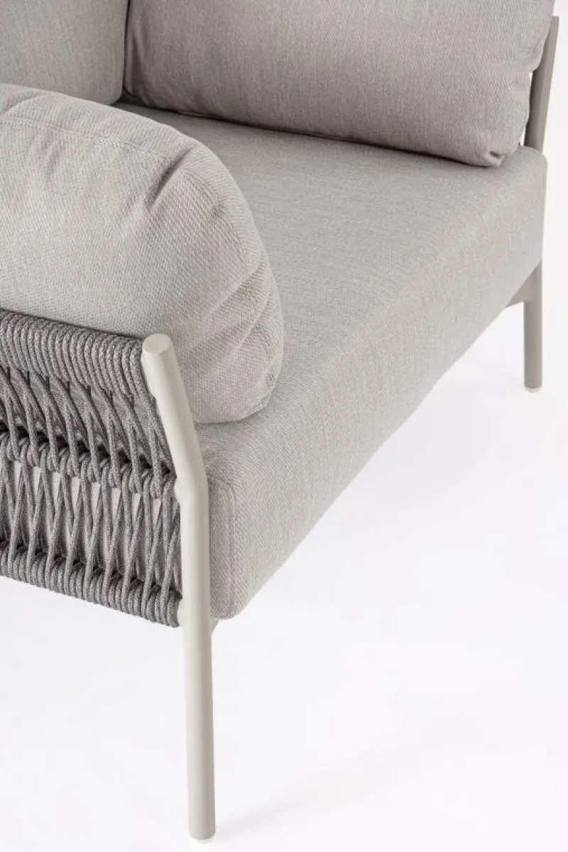 STRUTTURA IN ALLUMINIO VERNICIATO A POLVERE (POLIESTERE). INTRECCIO IN CORDA OLEFIN (100% POLIPROPILENE). CUSCINI SEDUTA E SCHIENALE SFODERABILI IN TESSUTO IDROREPELLENTE OLEFIN (100% POLIPROPILENE).