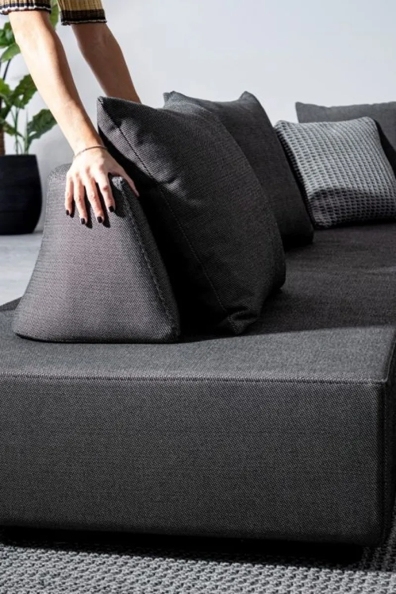 DIVANI E OTTOMAN CON STRUTTURA IN ALLUMINIO. SCHIENALI REMOVIBILI CON STRUTTURA IN ACCIAIO, GALVANIZZATA A CALDO E VERNICIATA A POLVERE (POLIESTERE). SEDUTE, SCHIENALI E CUSCINI SFODERABILI IN TESSUTO PER ESTERNO IN OLEFIN (100% POLIPROPILENE, 285G/M2), IDROREPELLENTE E RESISTENTE AI RAGGI UV (GRADO 7), IMPERMEABILIZZATO INTERNAMENTE CON RIVESTIMENTO IN TESSUTO