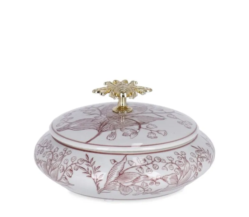 PORCELLANA CON DISEGNO OTTENUTO TRAMITE TECNICA DELLA DECALCOMANIA. ELEMENTO DECORATIVO IN METALLO COLORE DORATO. IMPERMEABILE INTERNAMENTE.