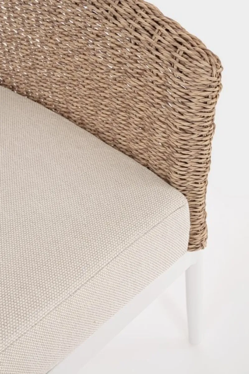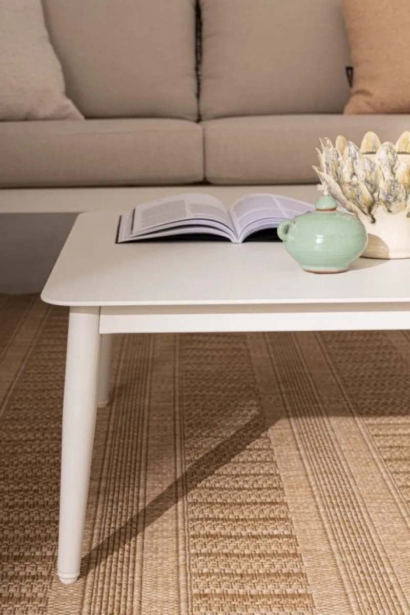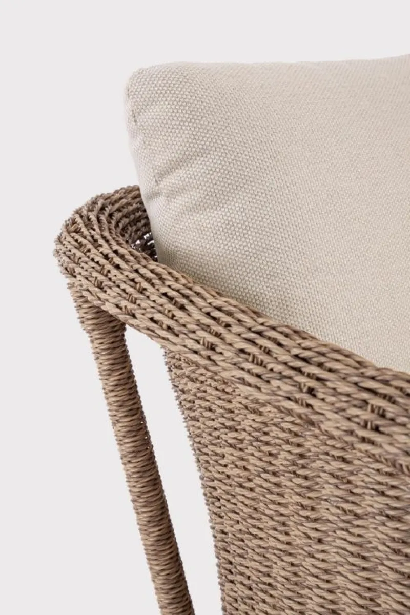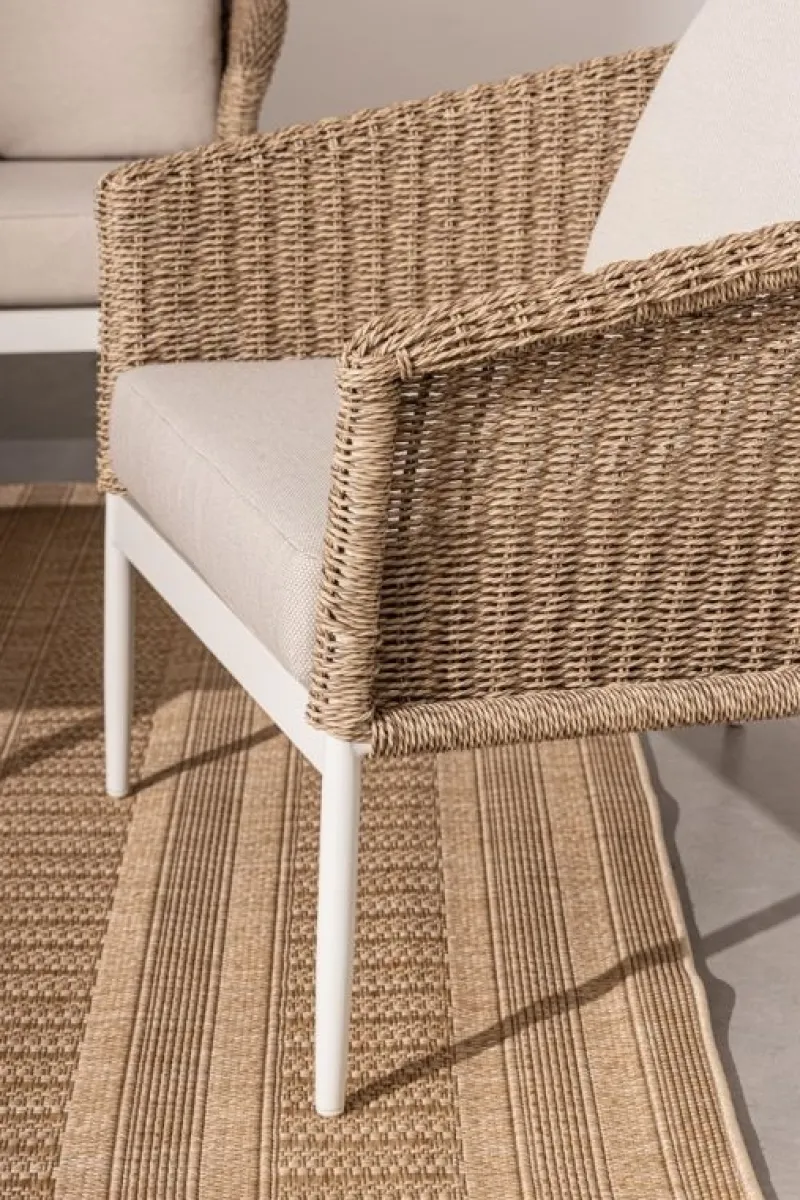 STRUTTURA IN ALLUMINIO VERNICIATO A POLVERE (POLIESTERE). SEDUTA RIVESTITA IN FIBRA SINTETICA (TONDA 3.5MM). CUSCINI SEDUTA E SCHIENALE SFODERABILI CON TESSUTO IDROREPELLENTE OLEFIN (100% POLIPROPILENE). GAMBE TAVOLINO (CON PIEDINI REGOLABILI E VITERIA IN ACCIAIO INOSSIDABILE) DA ASSEMBARE.